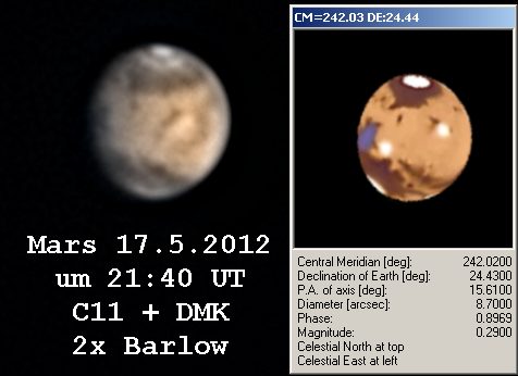 Am 17.5. war der Mars nur noch 8,7 Bogensekunden groß. Dennoch gelang eine gut aufgelöste Aufnahme.