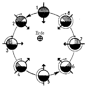 Der Mond bietet dem Beobachter immer wieder ein neues Bild. Dies liegt neben dem wechselnden Schattenwurf auch an der Libration. Dieser Effekt entsteht durch die elliptische Bahn unseres Trabanten. Die gebundene Rotation des Mondes ist ein linearer Prozeß. Die Umkreisung der Erde erfolgt jedoch mit einer ungleichmäßigen Geschwindigkeit. Dadurch bekommen wir Gelegenheit mal an der linken, mal an der rechten Mondkante vorbei zu schauen. Insgesamt sind nicht 50% sondern 59% der gesamten Mondoberfläche von der Erde aus sichtbar. Die rechte Grafik (3 kb) verdeutlicht dies. Außerdem ist die Mondbahn gegenüber der Achse Sonne-Erde um 5 Grad geneigt. Dadurch können wir Frau Luna zuweilen auf dem Kopf bzw. unter den Rock schauen. Die linke Aufnahme verdeutlicht das Geschehen (35 kb). Je nach Libration sehen wir die Krater am Mondrand mehr oder weniger flach und dadurch unterschiedlich perspektivisch verkuerzt.