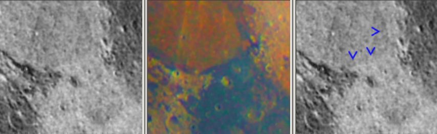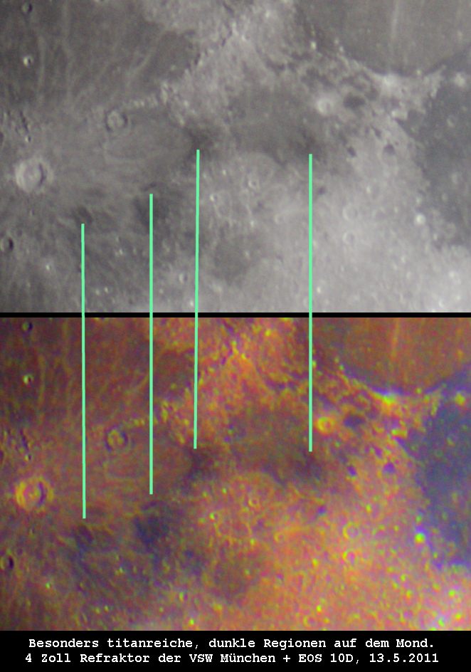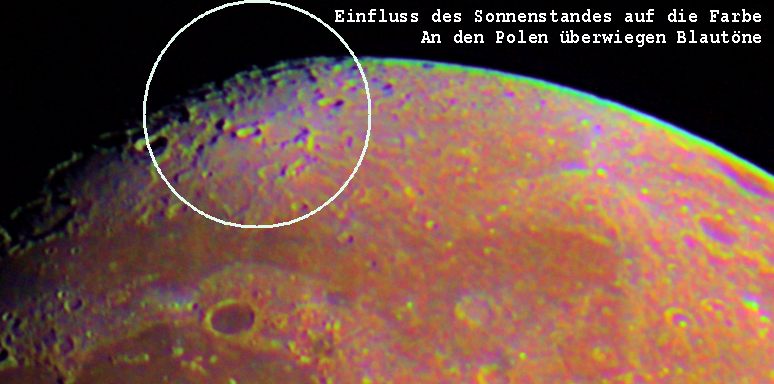 Rot erscheinen. Die dunkelsten Mare besitzen titanreiche Basalte, während in den helleren Maren und im Hochland das rote Eisen dominiert.