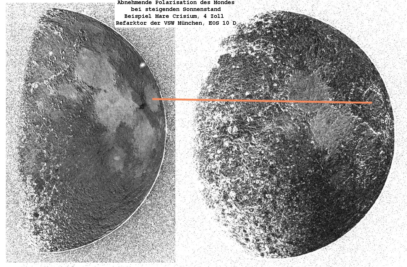 Besonders augenfällig ist die Abnahme der Polarisation im Mare Crisium. Am rechten