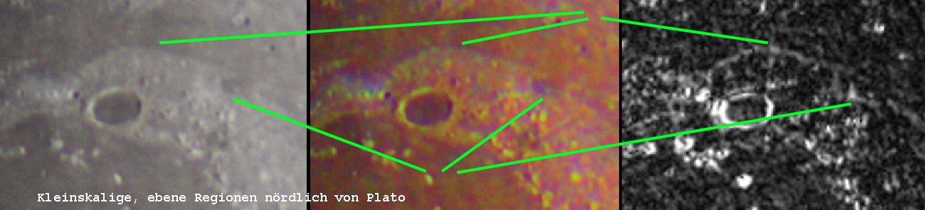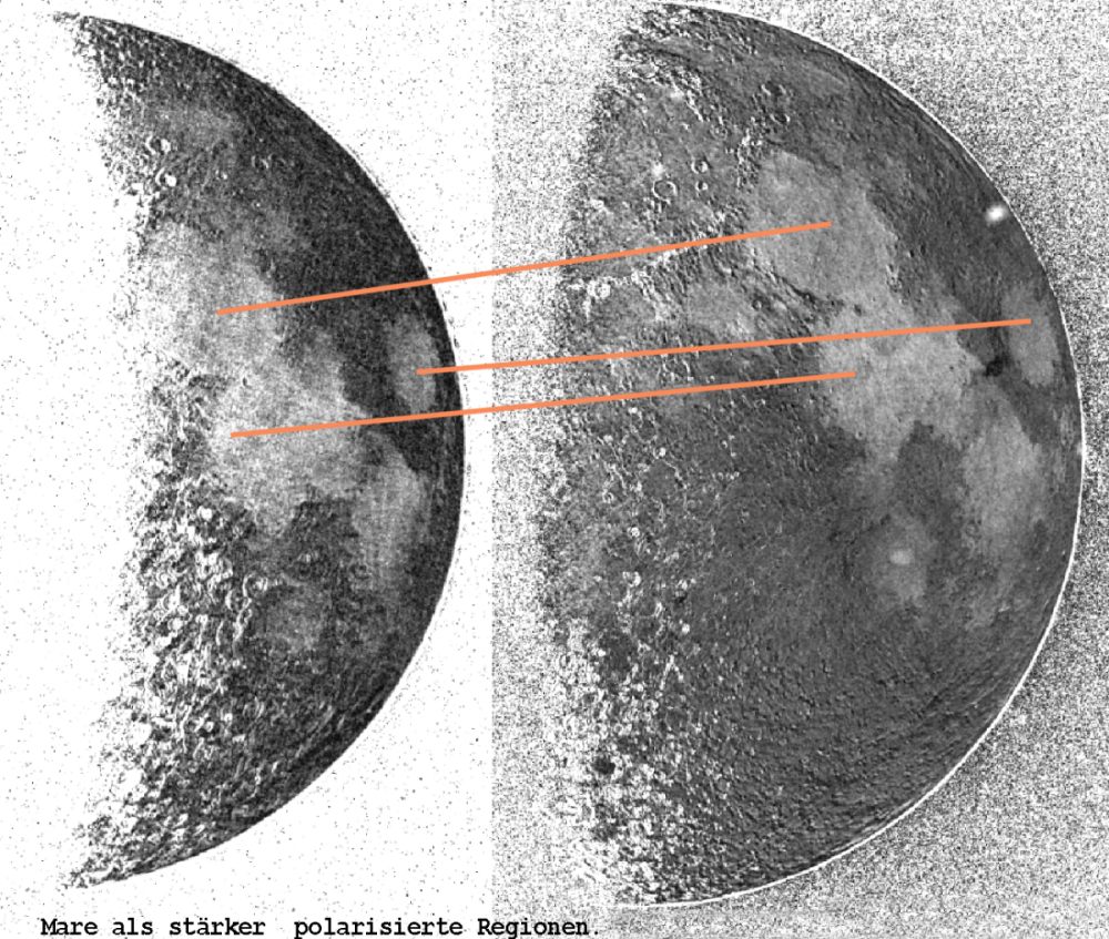 Helle Gebiete sind also stärker polarisiert. Die flachen, glatten Mare sind hell.