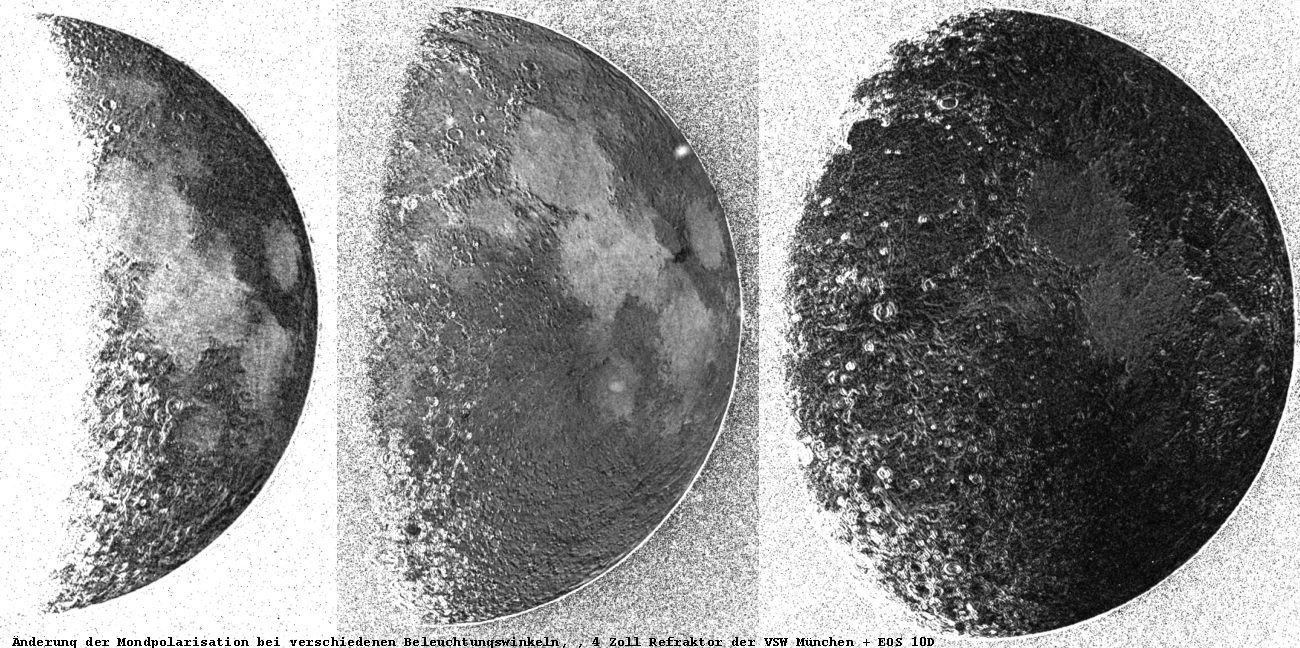 Von links nach rechts wird der Mond mit abnehmender Phase dunkler, die Polarisation lässt also