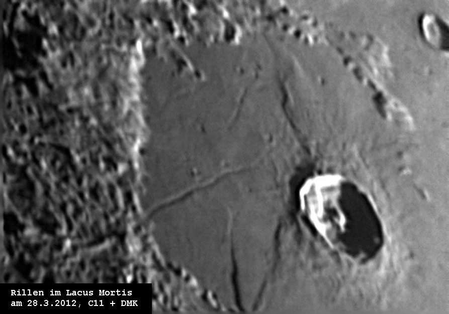Rillen im Lacus Mortis. Die Lunadome liegen günstig im Terminator und zeigen