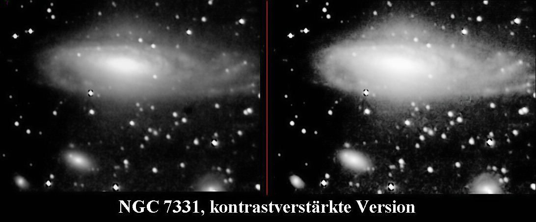 Auf der Aufnahme sieht NGC7331 irgendwie gestört aus. Auf der rechten Seite sind die Spiralarme länger als auf der Linken.
