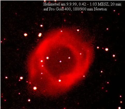Die runde Form entsteht durch eine Kugelschale die den Stern umgibt. Besonders gut ist dies beim Helixnebel zu erkennen. Er zählt zu den Prachtobjekten seiner Art und hat fast einen halben Vollmonddurchmesser. Dabei ist er aber sehr lichtschwach und nur auf langbelichteten Fotos gut zu erkennen (oben links 34 kb).