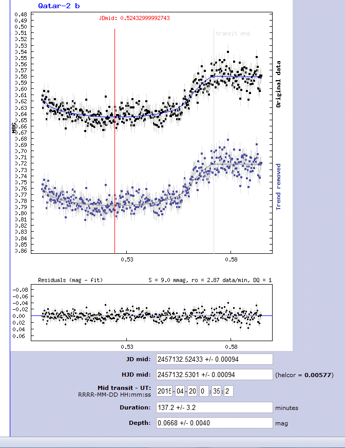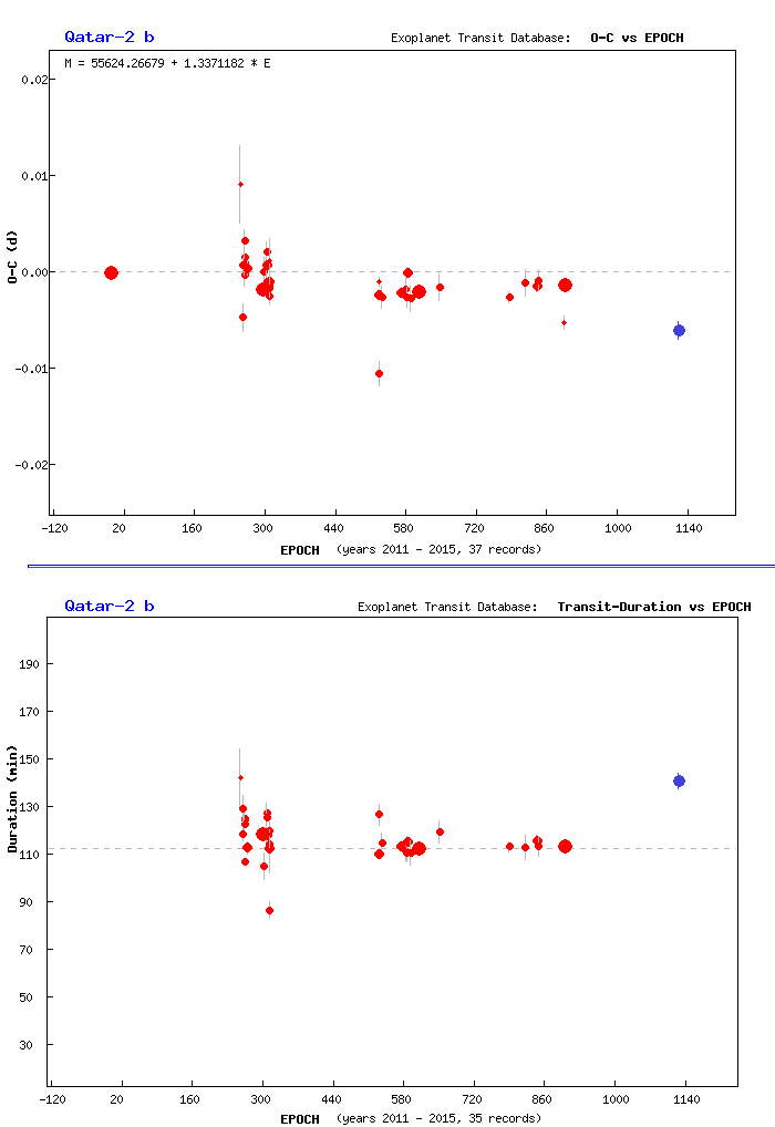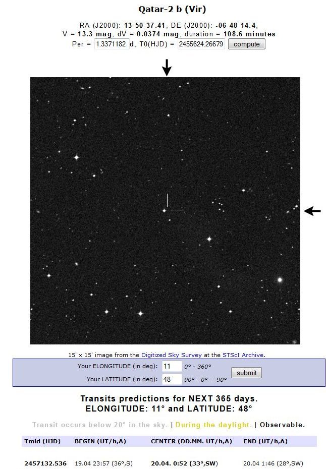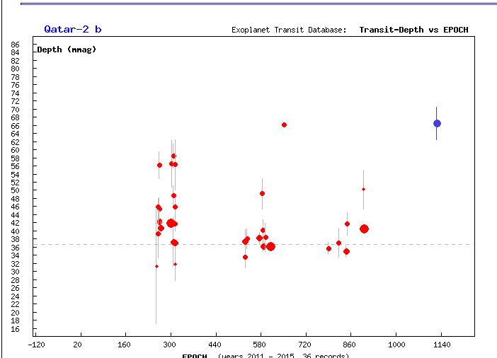Qatar-2b ist ein 13,3mag Stern mit Planetentransit im Sternbild Jungfrau. Die Periode liegt bei 1.337 Tage und die Amplitude ist 0,0374mag. Ab- und Anstieg der Helligkeit benötigen 108,6min.