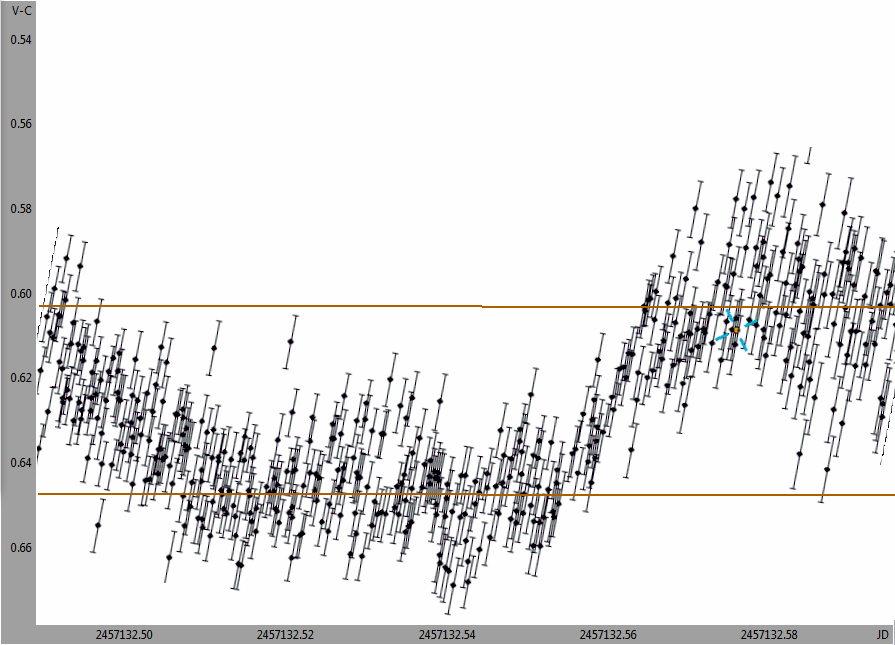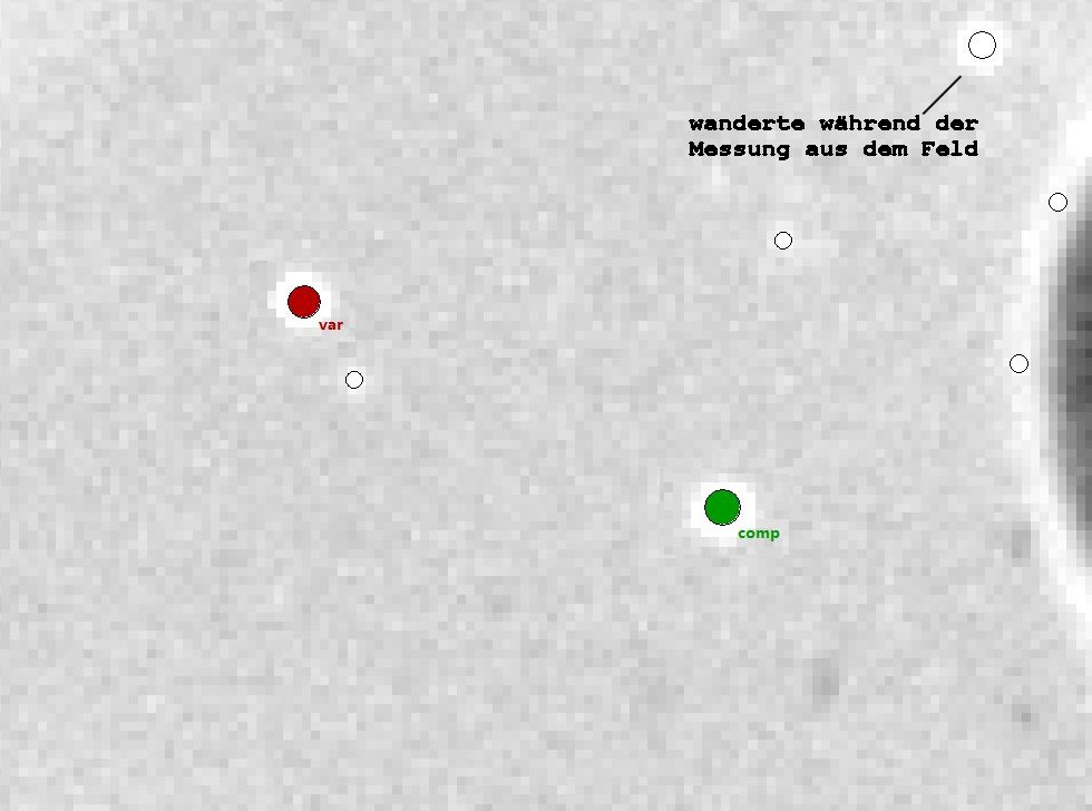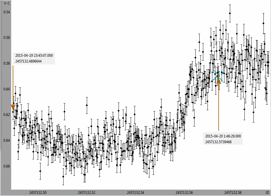 Eine plausible Erklärung wäre das der Vergleichsstern ebenfalls variabel ist. Leider läßt sich das nicht überprüfen da es im Feld keine passenden Referenzsterne gab. So konnte der Fehler nicht durch überkreuzende Messungen bestimmt werden. Diese Messung vom 19.4.15 ist daher leider nur bedingt aussagefähig.
