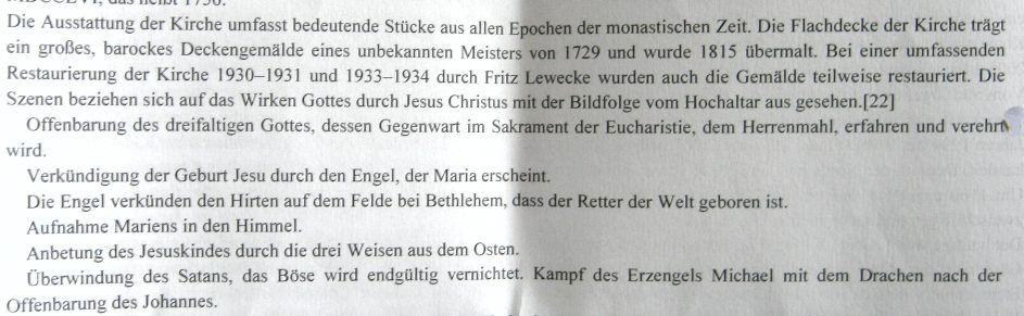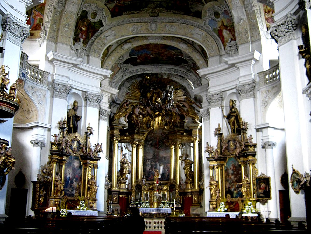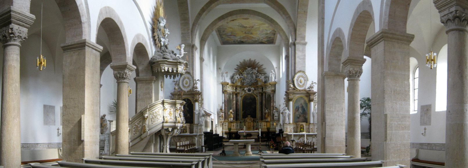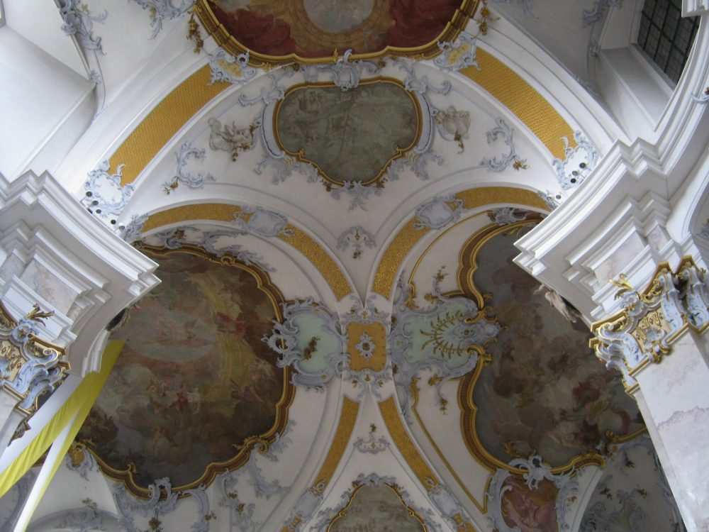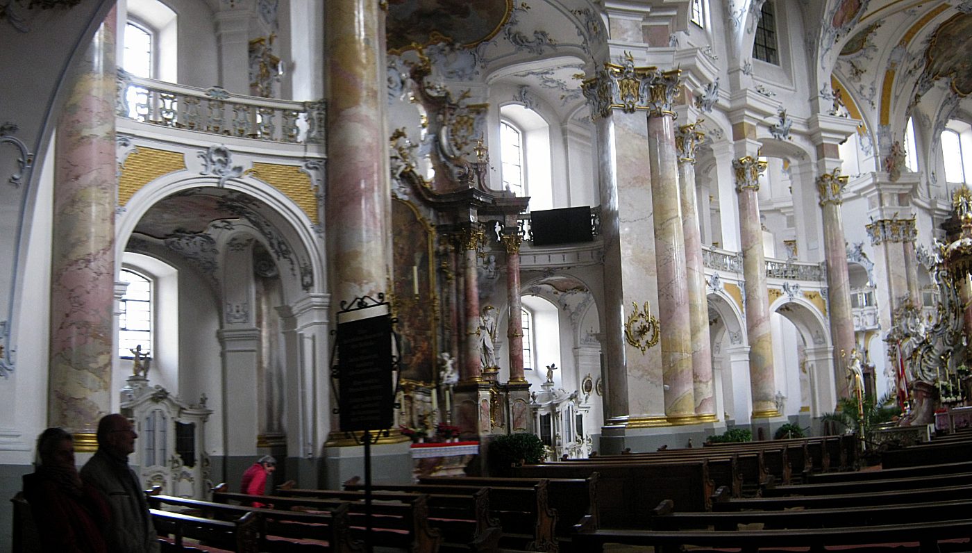 In der Kirche sah man deutlich woher Neumann die Idee mit den gekippten Gurtbögen hatte. Die Deckengemälde zeigen das Pfingstwunder und das letzte Abendmahl