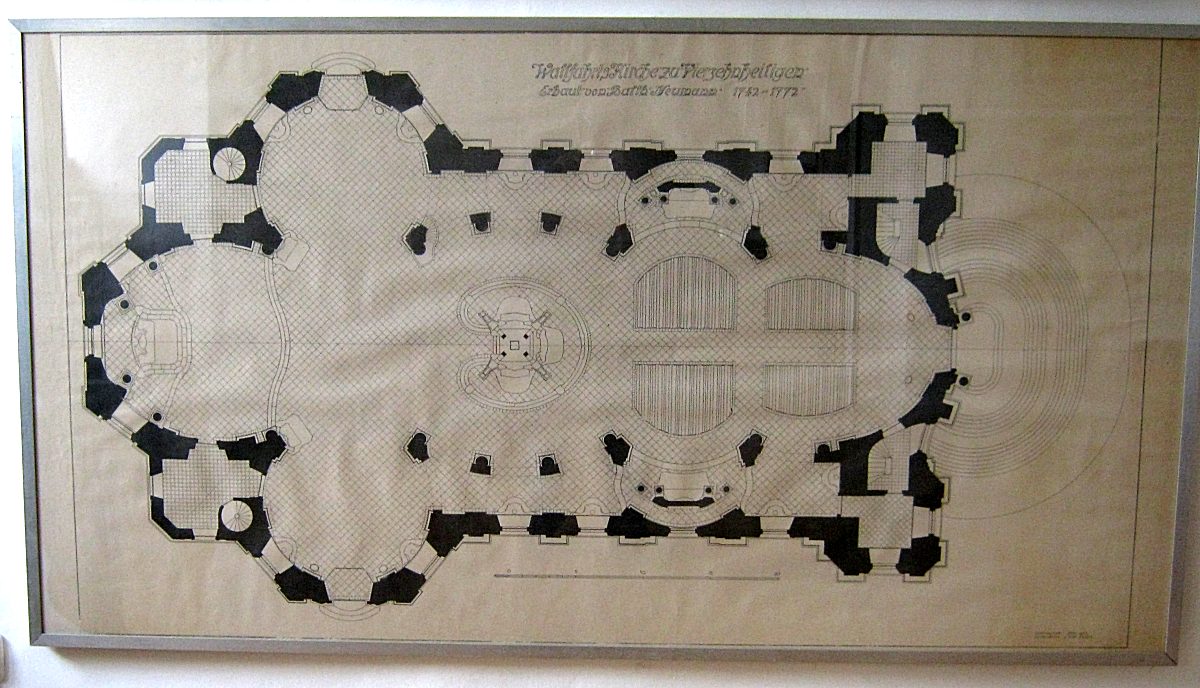 Kloster Banz ist einige Jahrzehnte älter als Vierzehnheiligen und diente als bauliches Vorbild. Der barocken Anlage fehlt noch die Leichtigkeit des verspielten Rokoko.