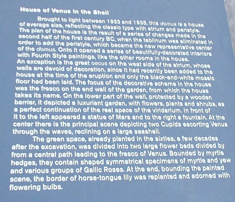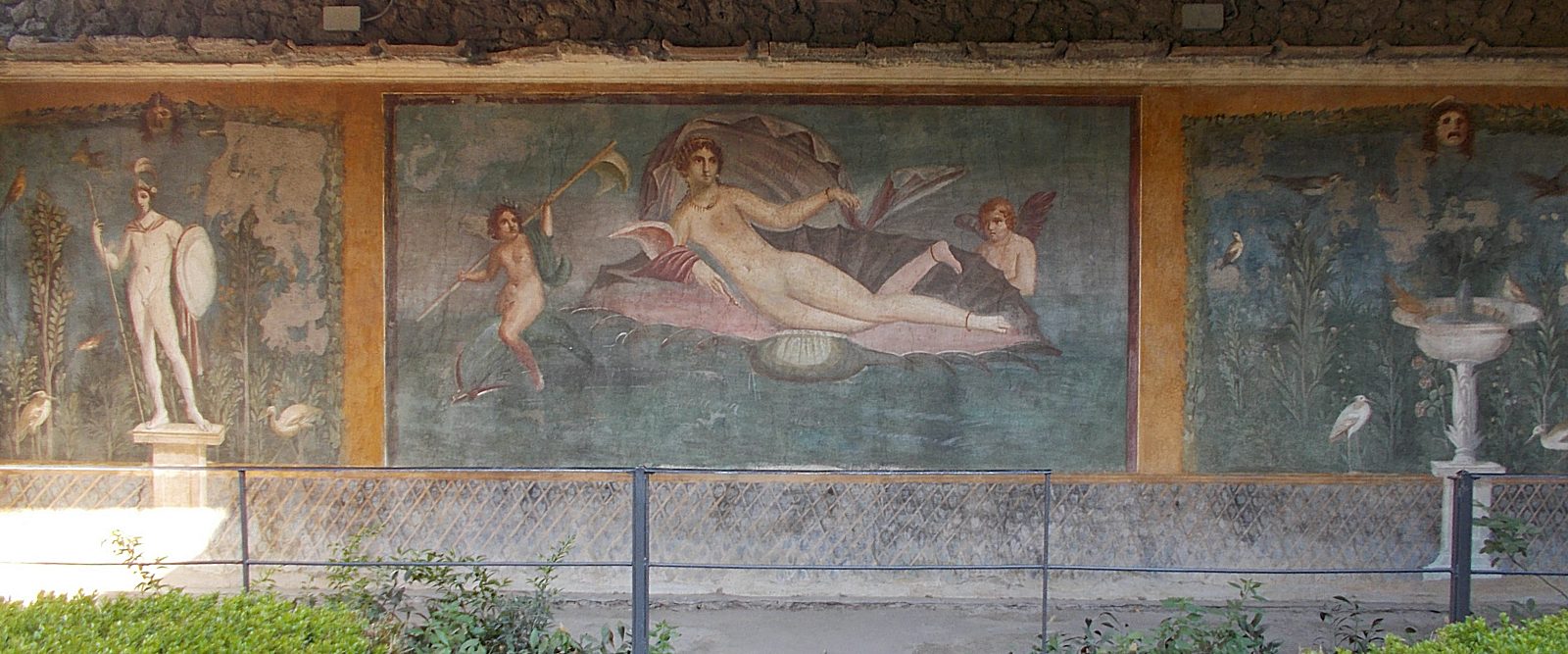 Eines der schönsten Fresken findet sich im Haus der Muschelvenus. Seitlich gibt es 2 Amorfiguren. Die Frisur entspricht der Mode aus der Zeit Neros. Das Fresko wurde erst bei der Reparatur nach dem Beben des Jahres 62 angelegt. Die Proportionen der Beine der Venus stimmen nicht. In der Vergangenheit wurde der vermeintlich unfähige Maler oft belächelt. Ein Blick auf das überraschte Gesicht des rechten Amors spricht jedoch für ein gezieltes Vorgehen. Dadurch ergibt sich ein theatralischer Effekt. In der Hand hält die Venus einen Fächer und den vom Wind aufgeblasenen Schleier. Accessoires die sich auch in der Malerei der Renaissance wiederfinden. Die göttlichen Nacktheit wird vom Goldschmuck betont. Links neben der Venus ist ihr Ehemann Mars zu sehen.