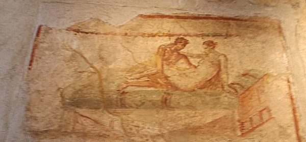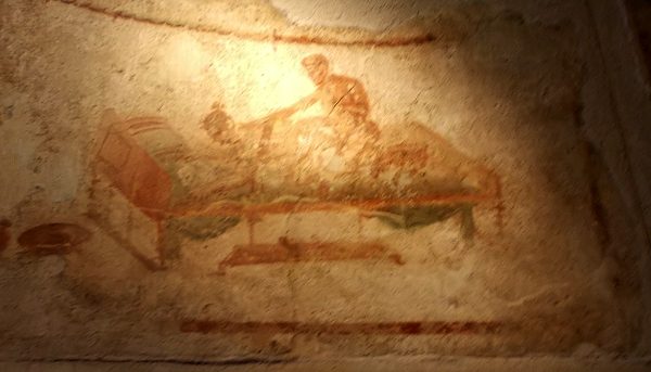 Pompeji soll etwa 30 Bordelle besessen haben. Oft waren es nur kleine ´1-Frau-Betriebe´. Neben den Gladiatorenkämpfen zeigt sich hier am besten die menschenverachtene Basis der Römischen Zivilisation. I.d.R. wurden Sklavinnen zu dieser Arbeit gezwungen. Die größte gefundene Anlage hatte 10 ´Kabinen´ die nur durch Vorhänge vom Gang getrennt waren. Die Stadt hatte ca. 10.000 Einwohner. Das große Angebot sorgte für niedrige Preise. Die ´Dienstleistung´ kostete 2 Asse. Die Asse waren Bronzemünzen und entsprachen etwa dem Wert eines Laib Brot. Über den gesamten Tag verbrauchte eine Familie, die in bescheidenem Wohlstand lebte pro Person etwa 8 As am Tag.