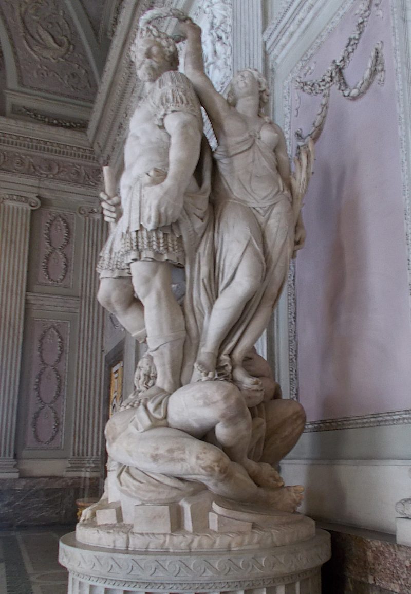 Die Figuren im Aufgang stehen für die königliche Majestät sowie für Verdienst und Wahrheit