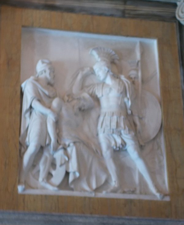 Stuckatur der Göttin Minerva eingerahmt von Gerechtigkeit und Stärke im Saal der Astraea