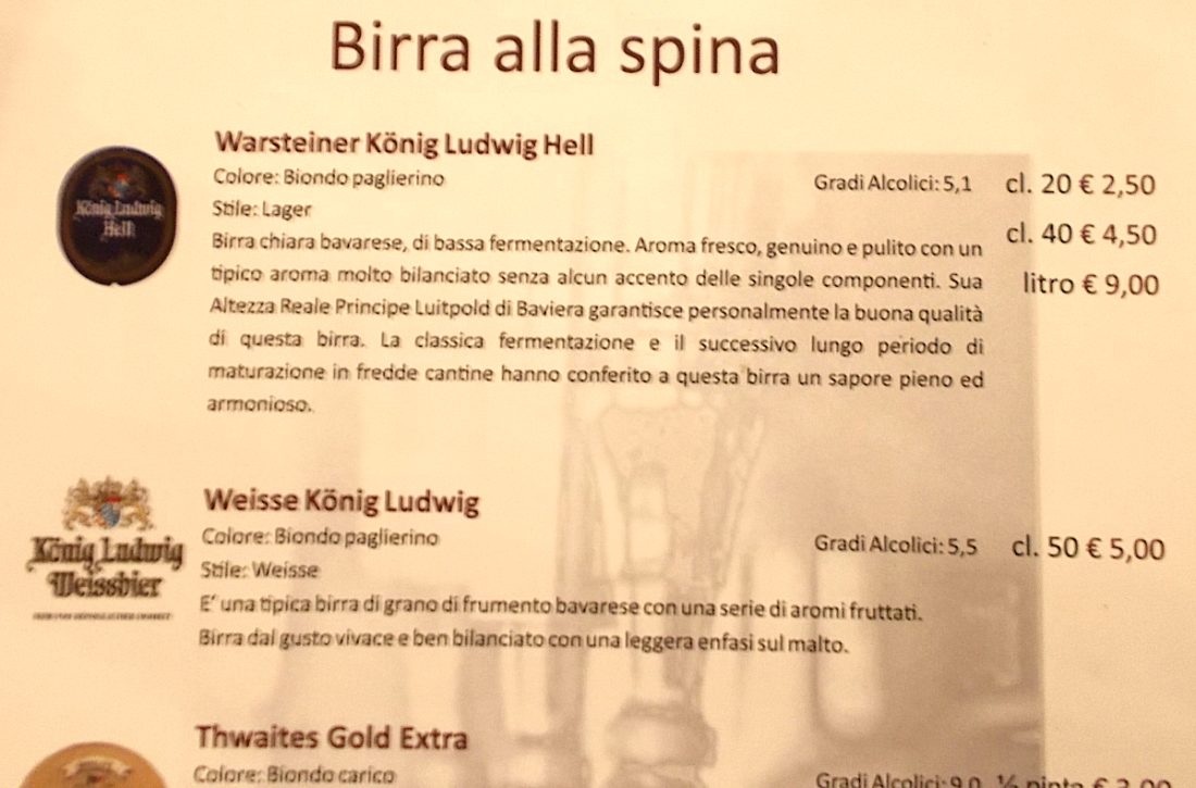 Am Abend gab es ein deutsches Bierchen in einem ital. Restaurant das für seine Bierspezialitäten berühmt ist. Die Karte enthielt eine Wahrheit zu einem vermeintlich Bayrischen Bier die man in Deutschland verschweigen würde.