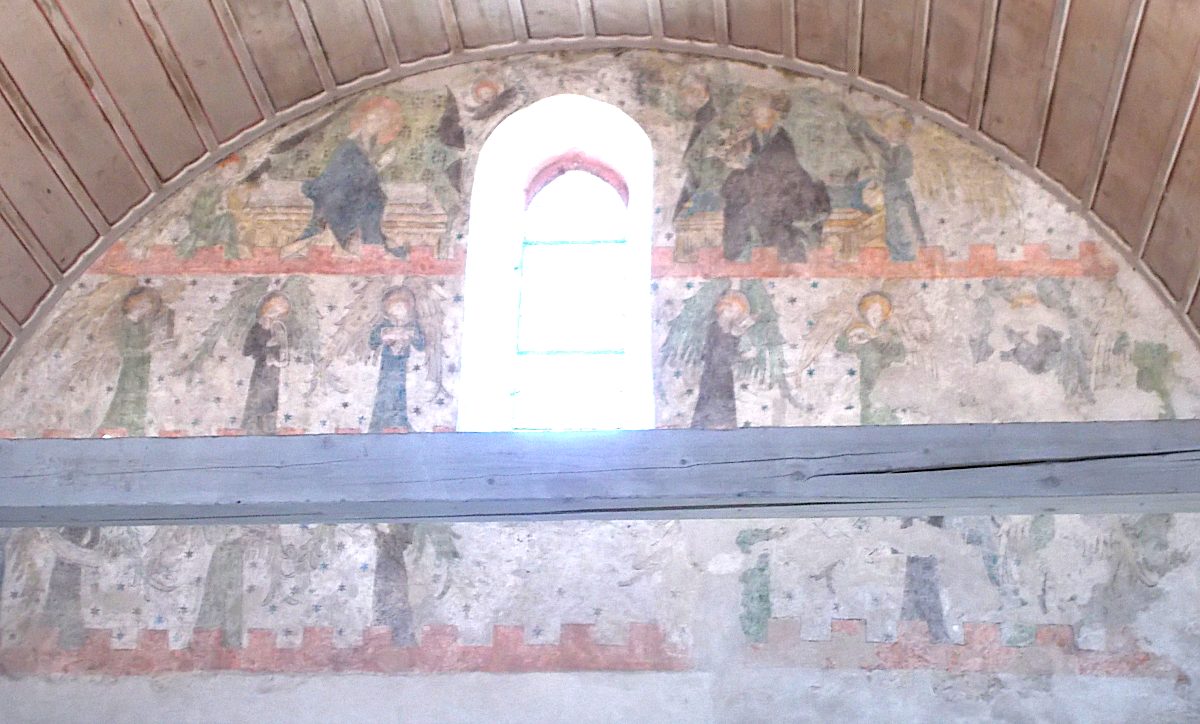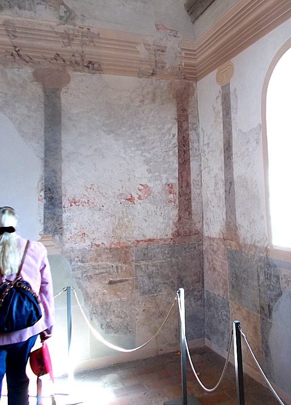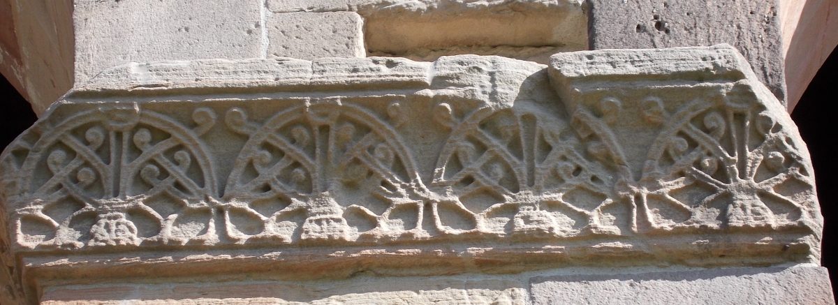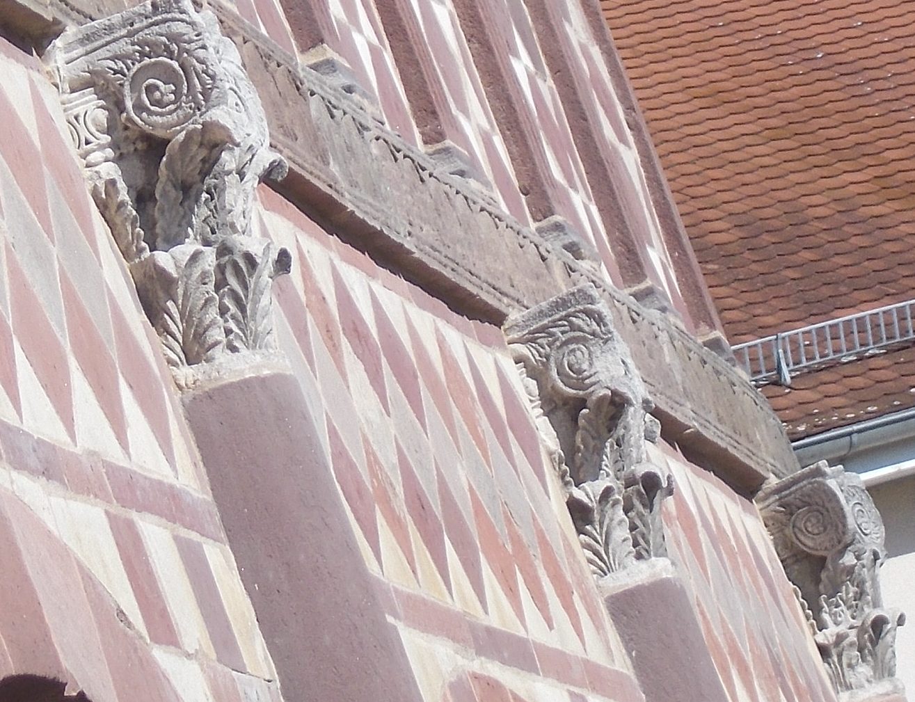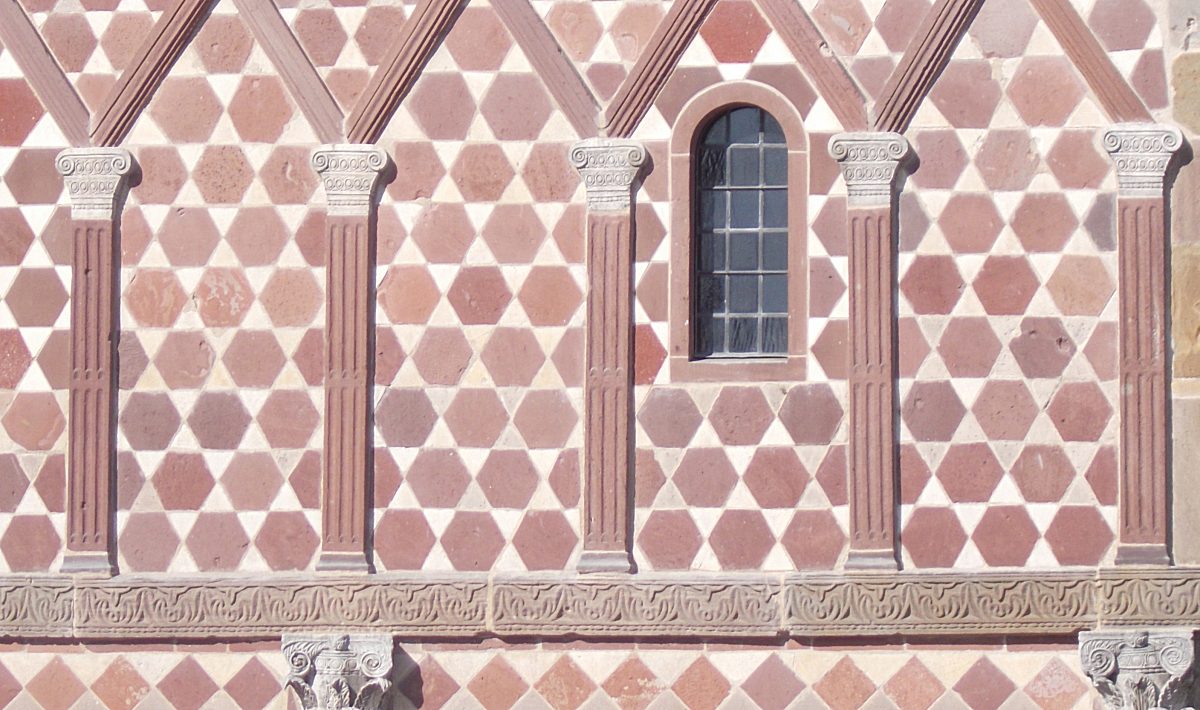 Die Flächen sind in rotem und weißem Sandstein gehalten, unten in Quadraten, oben in Sechs- und Dreiecken. Es handelt sich nicht um Kacheln, sondern um verschiedenfarbige behauene Steine in Wandstärke. Das erklärt den guten Erhaltungszustand nach 1200 Jahren.