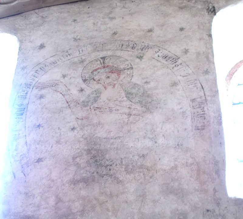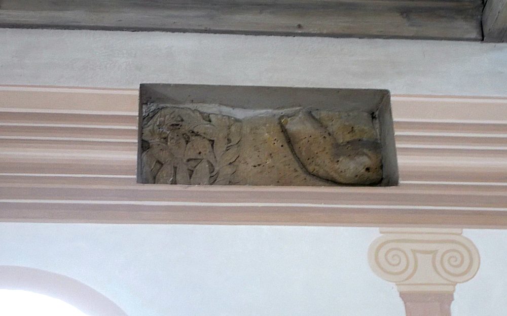 Im Obergeschoss eine Scheinarchitektur aus kannelierten Rechteckvorlagen, Kapitellen im ionischen Stil, wobei sie typisch korinthische Akanthusblätter aufweisen (Kompositkapitell), und Dreiecksgiebeln.