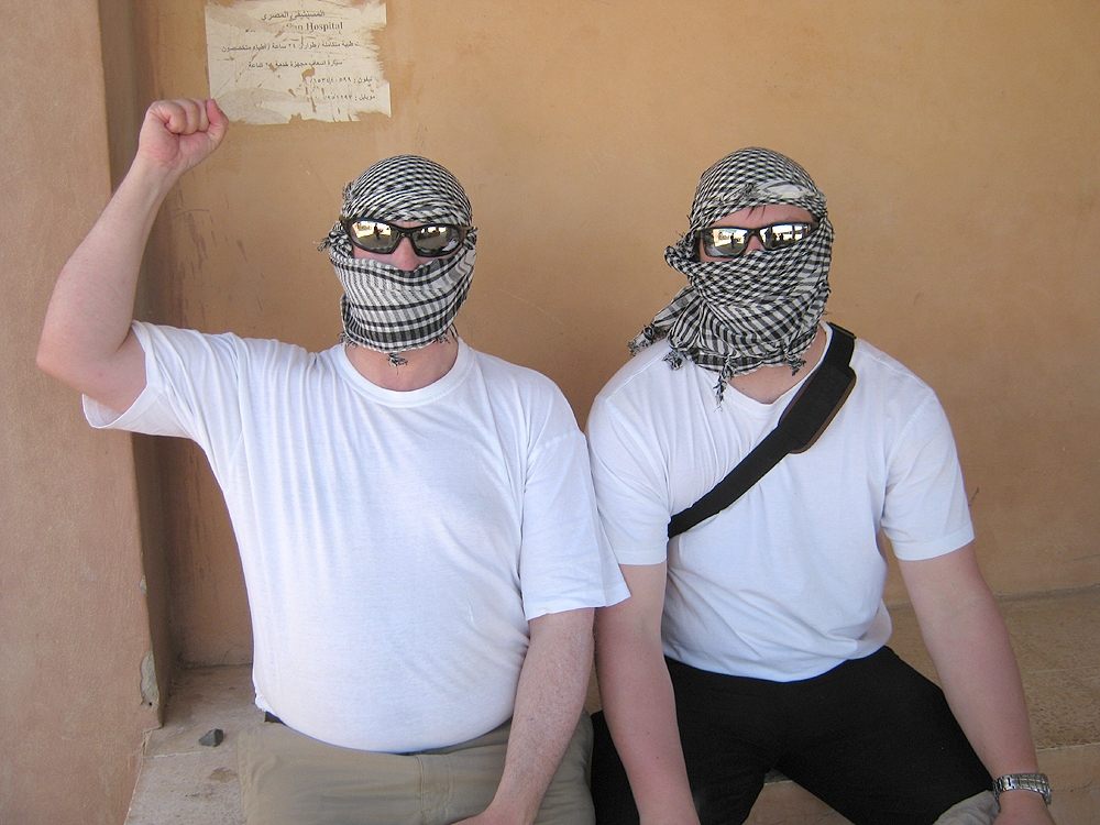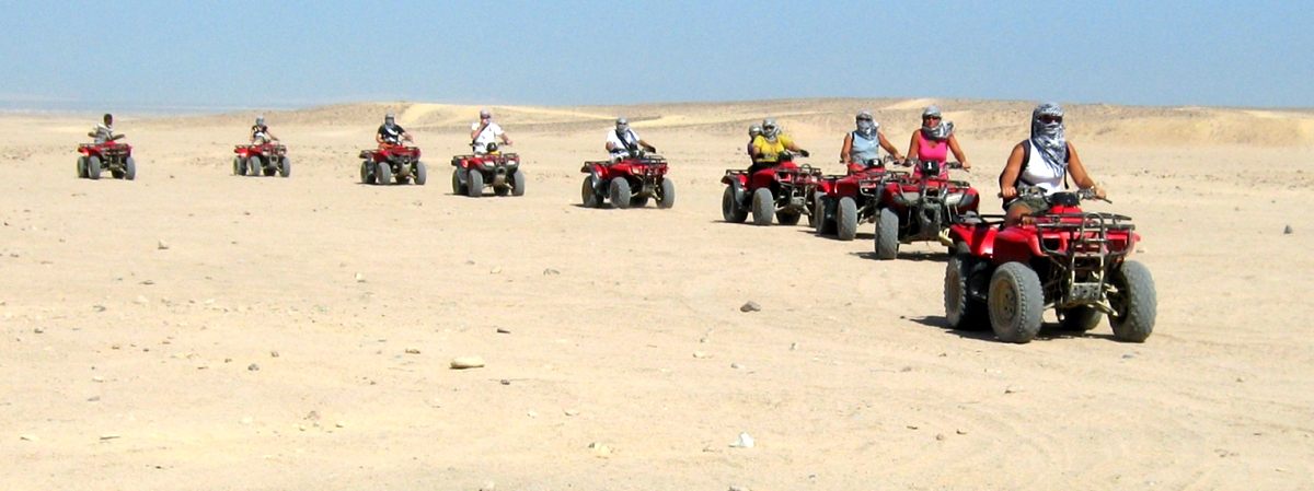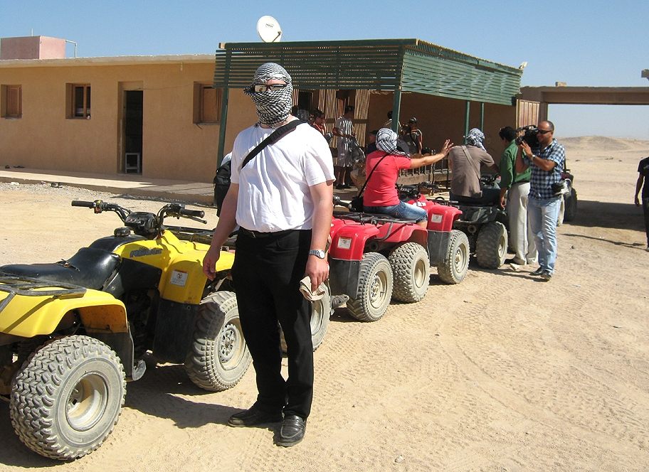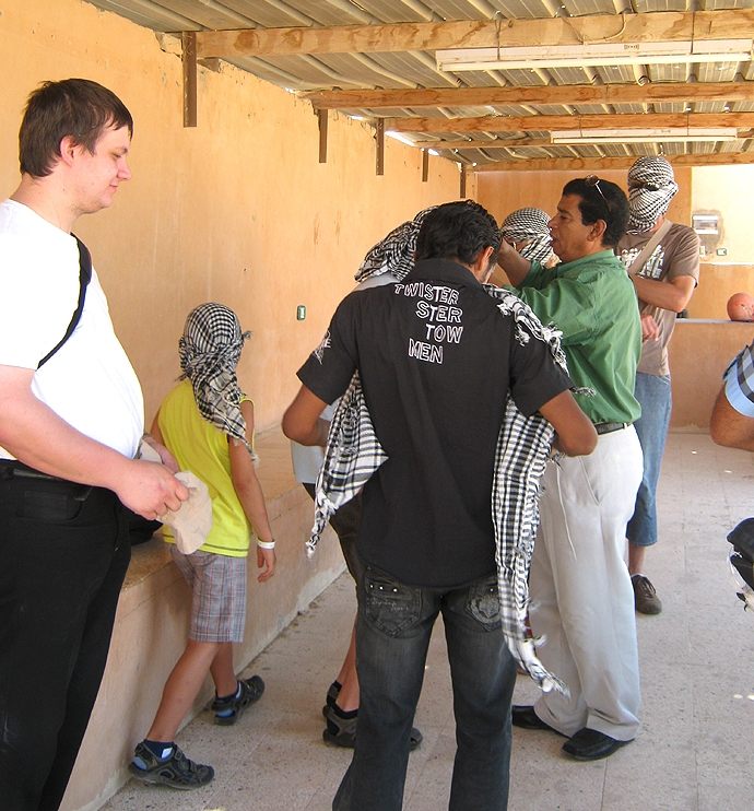 Vor der Fahrt wurden wir fachgerecht ausstaffiert. Jeder bekam einen Beduinenschutztuch und eine Sonnenbrille. Als wilde Taliban verkleidet stiegen wir auf die Quads.