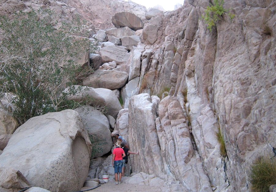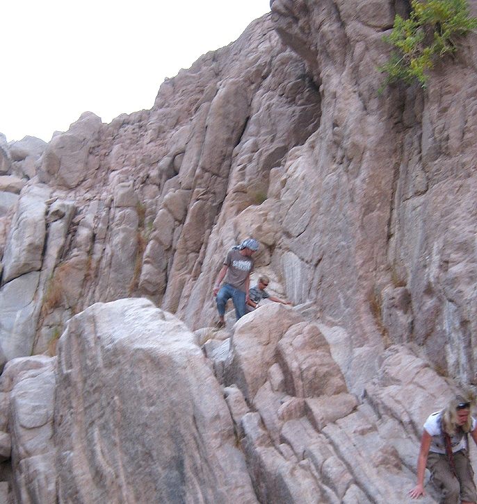 Bei der Kraxelei zum Ziel waren vertikal gestellte Sedimentschichten zu sehen. Das Wasser vertiefte mit der Zeit die Spalten und Klüfte.