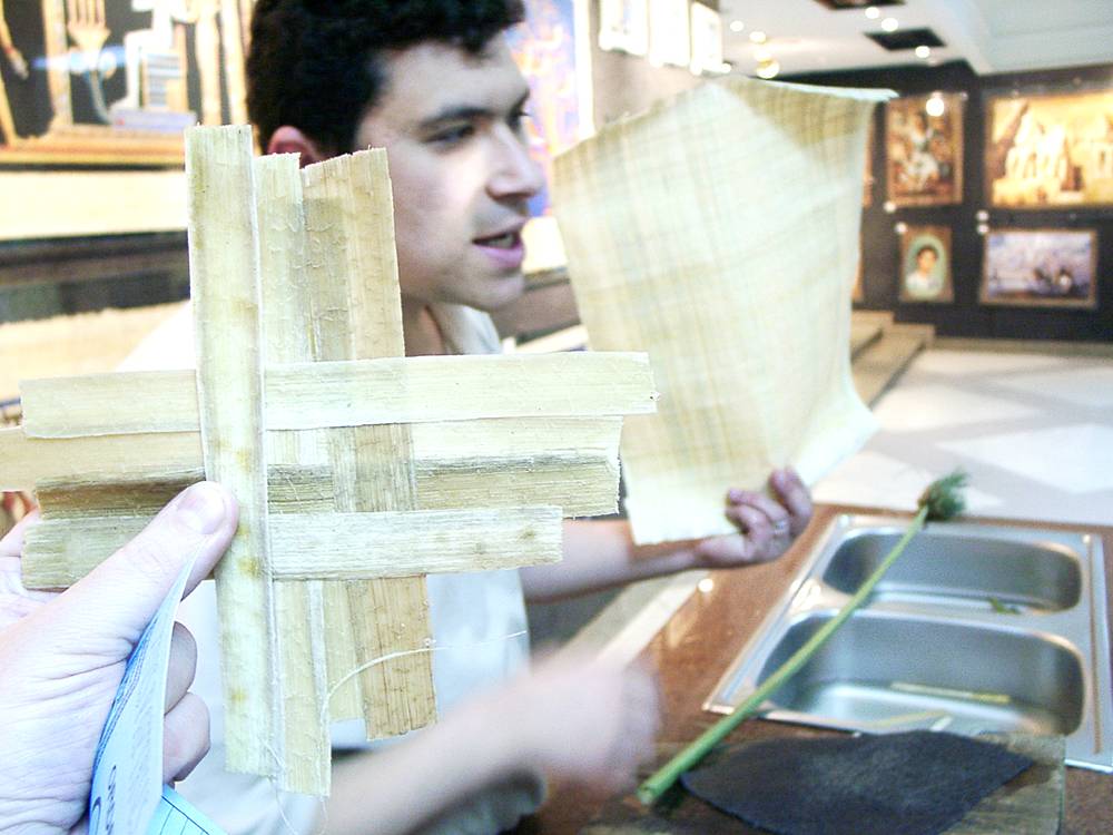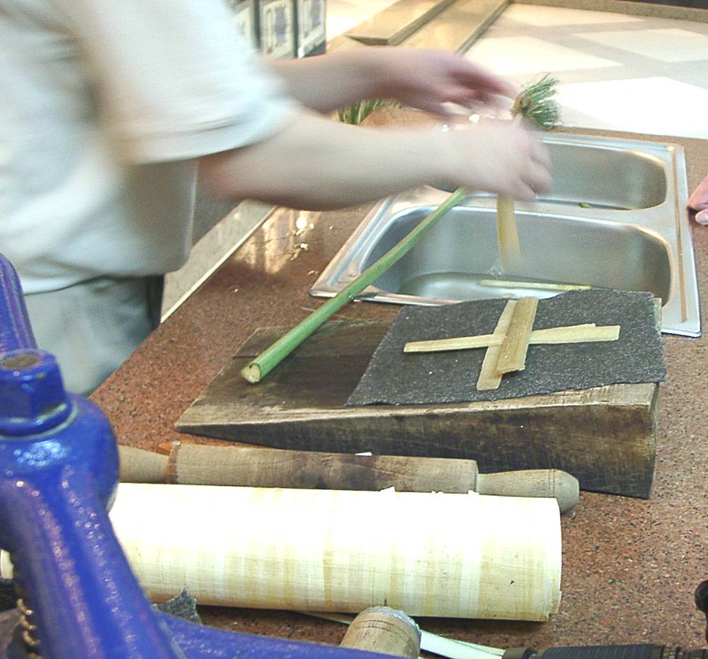 Zur Papierhesrstellung wird die Pflanze in Streifen geschnitten und diese Streifen kreuzweise übereinandergelegt.