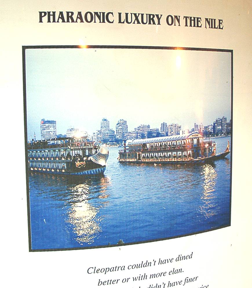 Das Schild am Eingang des Restaurant-Schiffes verspricht, dass auch Kleopatra kaum besser