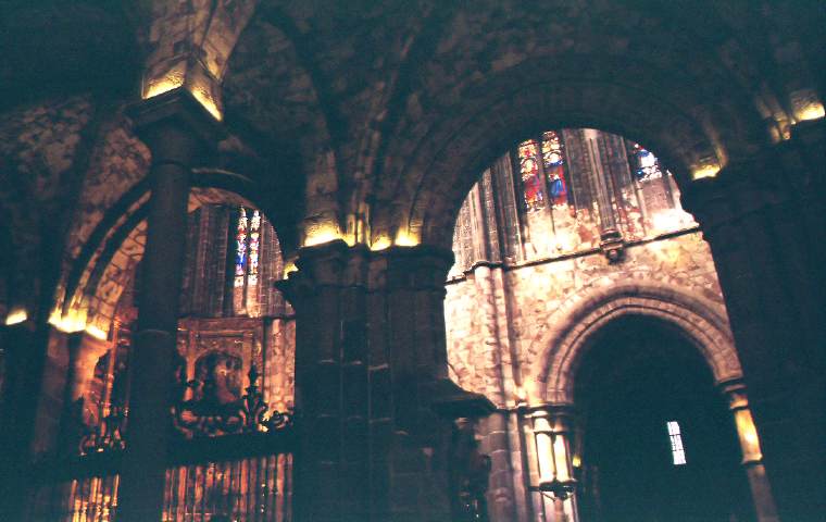 Durch die bunten Glasfenster und ungetünchten Wände entsteht ein etwas dusterer