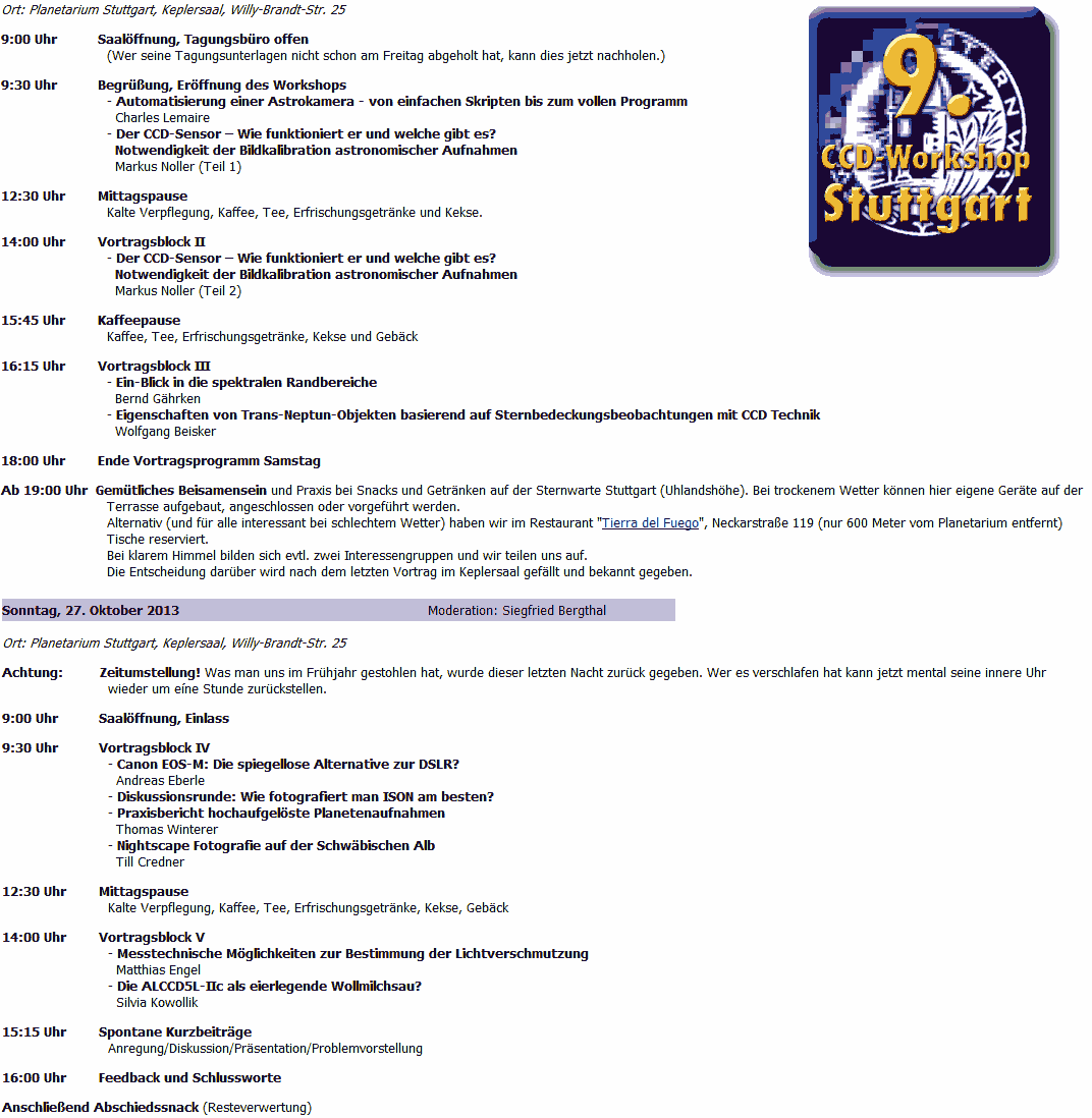 Der 9. Stuttgarter CCD-Wotkshop fand am letzten Oktoberwochenende 2013 statt. Die Organisatoren Otto Farago vom Planetarium Stuttgart und Andy Eberle von der Schwäbischen Sternwarte e.V. hatten ein anspruchsvolles Programm zusammengestellt.