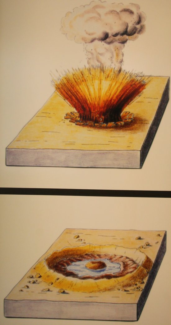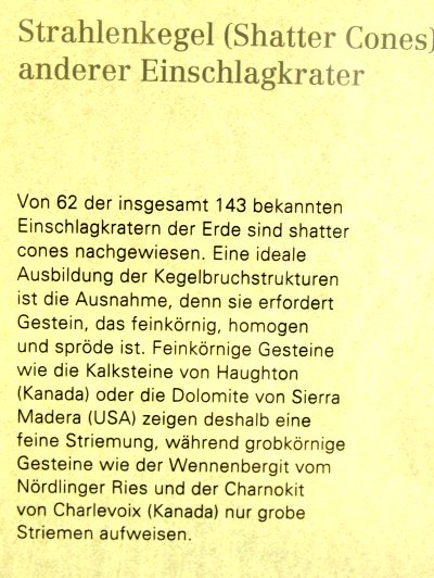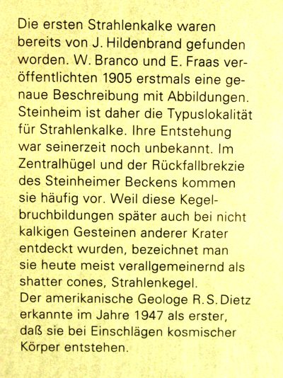 Die runde Form galt schon vor 100 Jahren als Beleg für eine kosmische Entstehung. Bewiesen wurde der Einschlag aber erst in den 50er Jahren als man Gesteine von unterirdischen Atombombenversuchen mit den geschockten Mineralien des Beckens verglichen hat. Typisch sind die kegelförmigen Strahlenkalke die auch als Shatter-Cones bekannt sind.