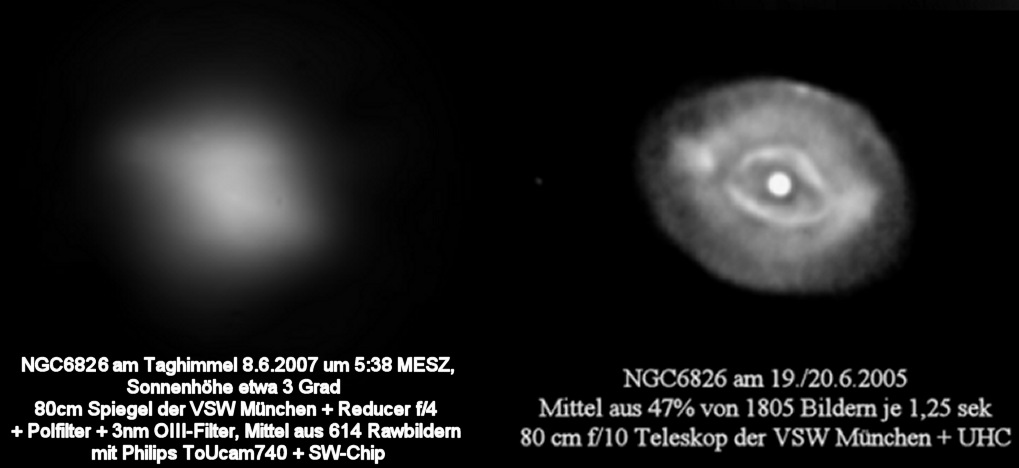 durch einen engeren OIII-Filter mit nur 3 nm HWB fotografiert. Zudem stand der Nebel mit 90 Grad Sonnenabstand