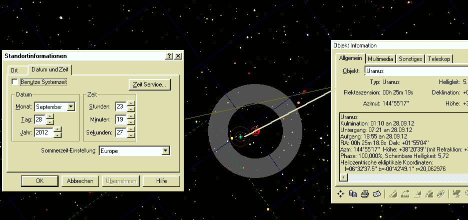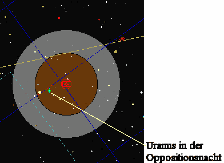 Die folgende Grafik zeigt die Lage von Uranus relativ zum Erdschatten