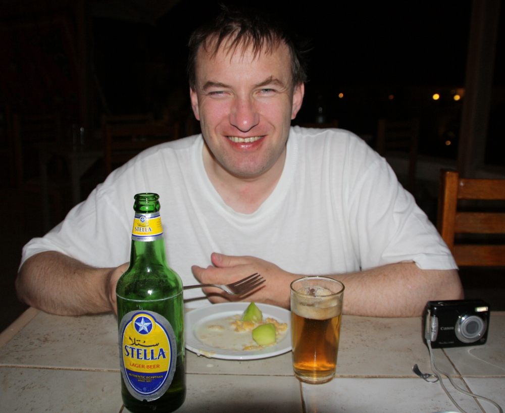 Beim ersten Abendessen fiel der Blick auf die Bierflasche und es war