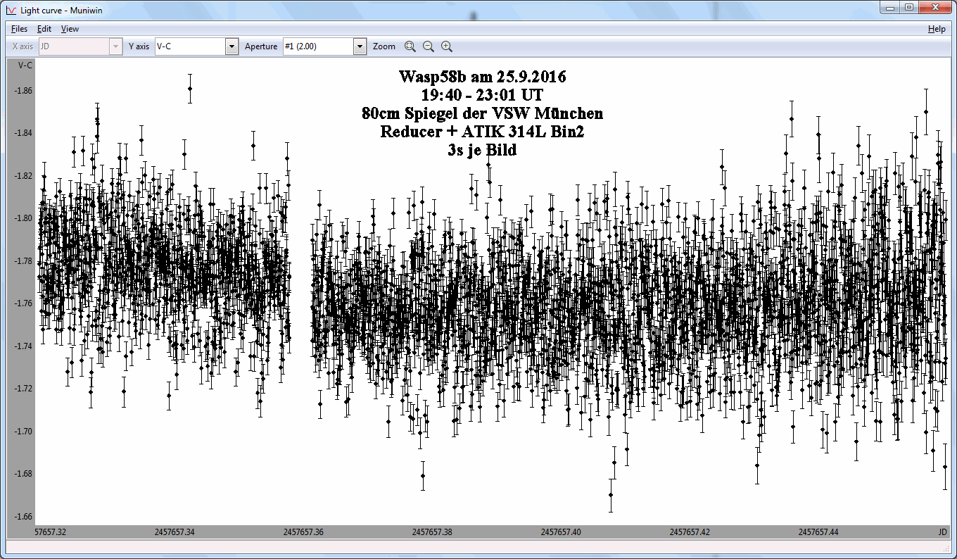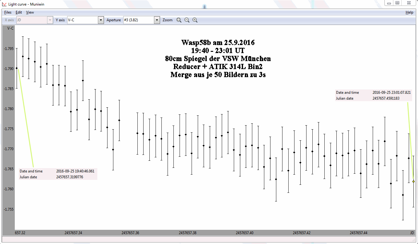 Eine Amplitude von 0,0156 mag ist ohne Autoguiding in der münchener Innenstadt schon fast an der Nachweisgrenze. Dennoch wurde eine Messung versucht. Leider gab es 30 min vor dem Ende des Transits einen Computerabsturz, so dass nicht die vollständige Kurve aufgezeichnet werden konnte. Immerhin scheint doch ein Abstieg erkennbar zu sein.