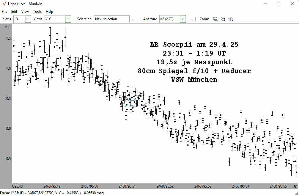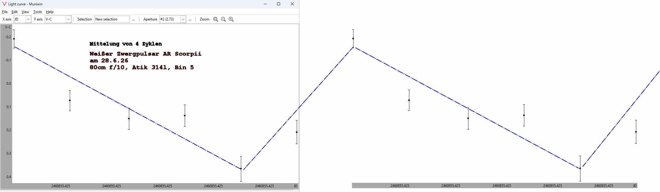 Die Streuung ist bei AR-Scorpi sichtbar stärker als bei einem Vergleichsstern,