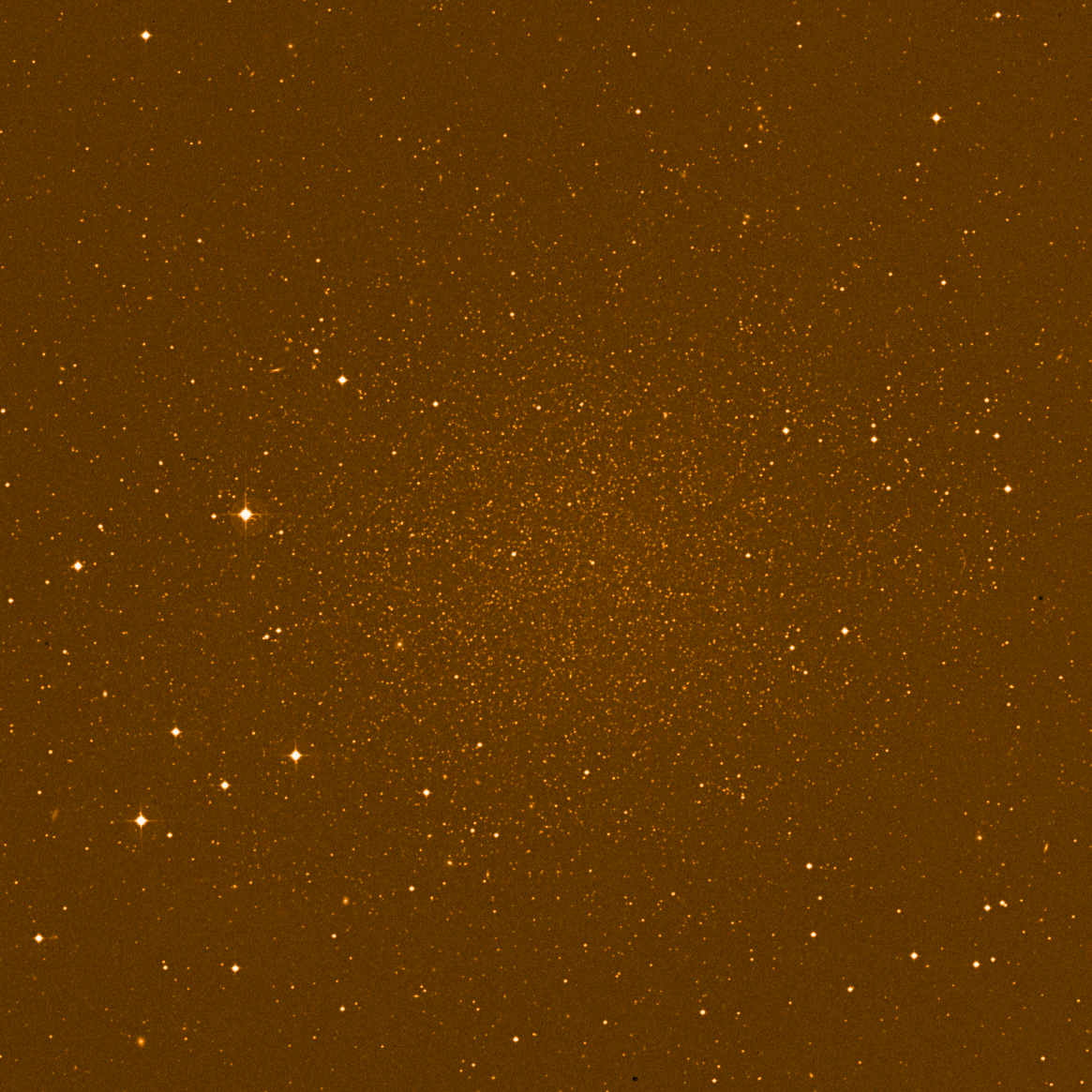 Die Sterne der Zwerggalaxie streuen in einer Ellipse über etwas mehr als ein halbes Grad.