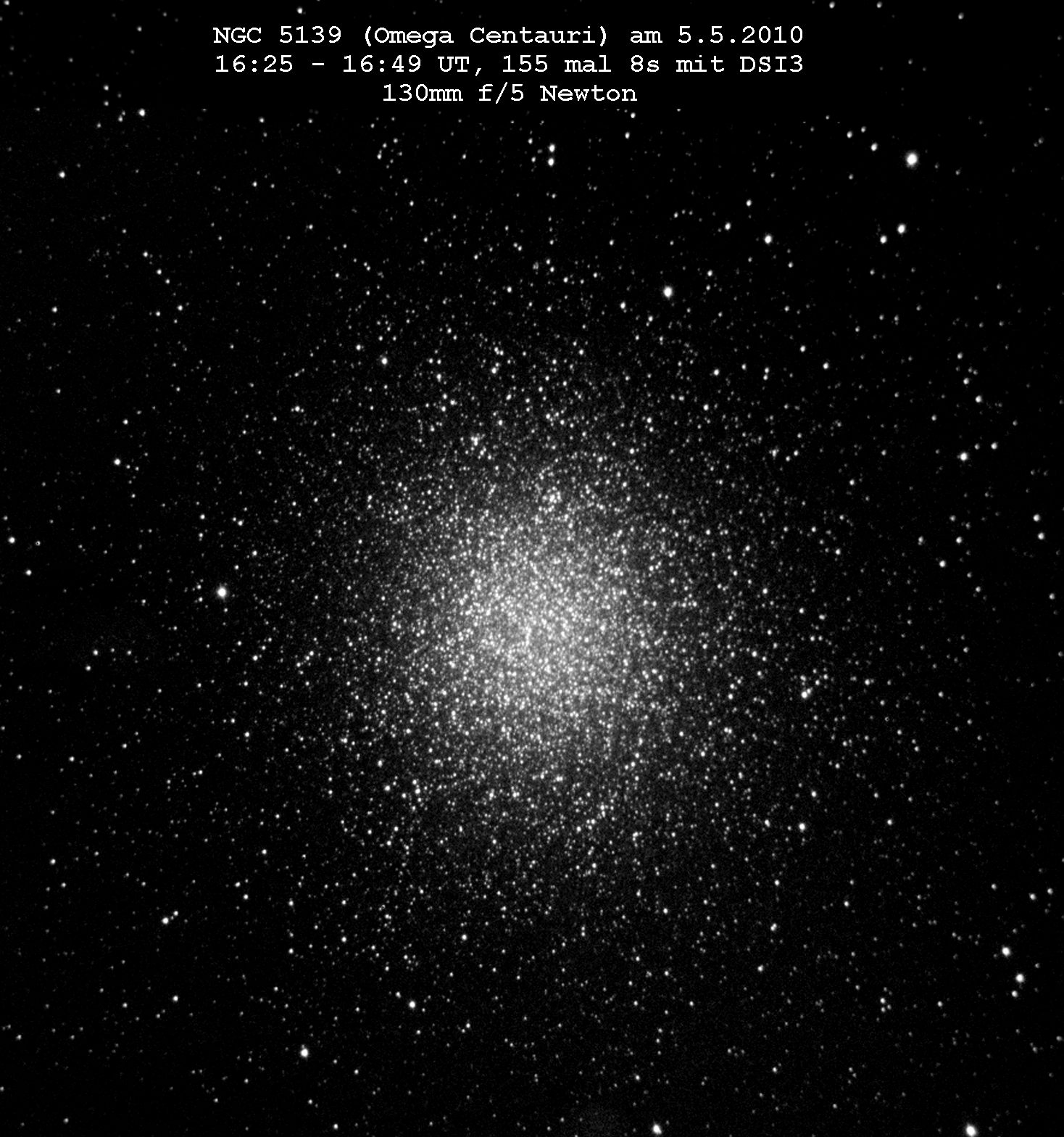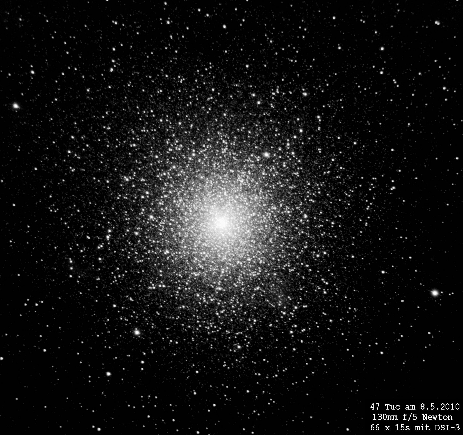 Kugelsternhaufen. Die Zweiteilung bei der Helligkeitsverteilung ist bei diesen Foto am besten zu erkennen.