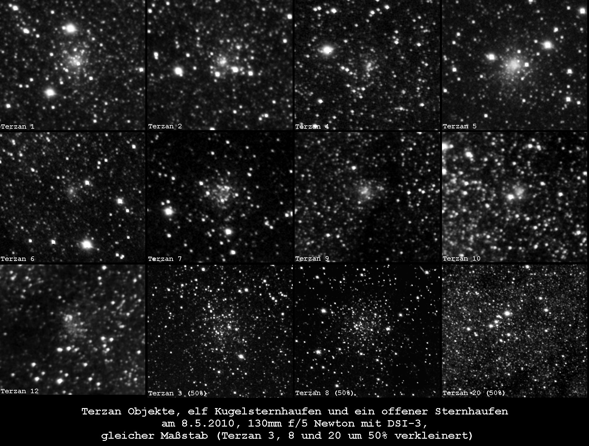 Alle Objekte haben den gleichen Abbildungsmaßstab, nur Terzan-3, Terzan-8 und Terzan-20