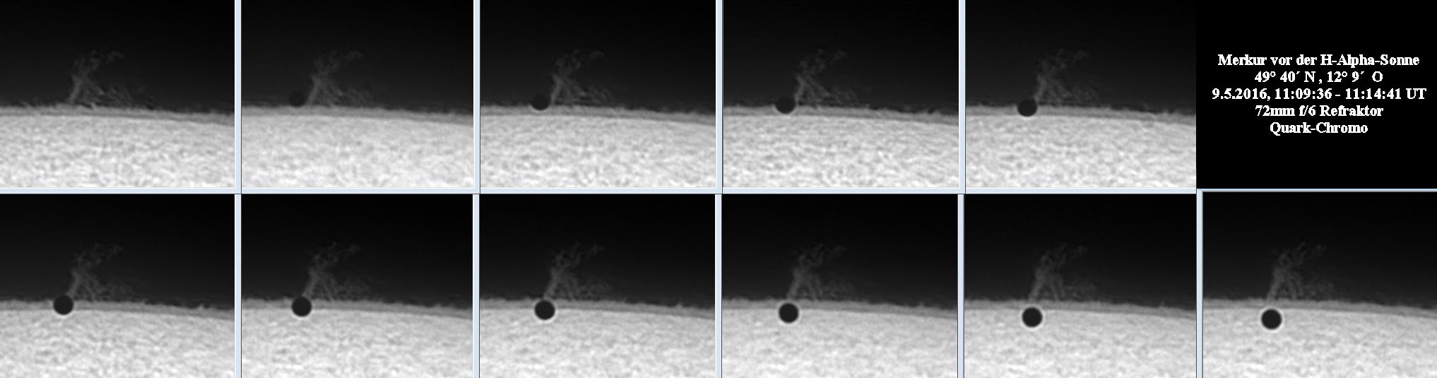 Der Eintritt erfolgte unter besten Bedingungen. Durch einen glücklichen Zufall streifte Merkur eine kleine Protuberanz. Der Planet ist vor der Chromosphäre zu sehen. Der Abstand zwischen den Bildern liegt bei nur 30 Sekunden.