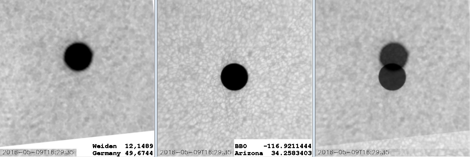Ab 17 Uhr wurde von H-Alpha auf visuell umgestellt. Hierbei wurde ein 80mm f/15 FH-Refraktor mit einem Herschelkeil verwendet. Dieses System liefert einen optimalen Kontrast. Ziel war es Merkur vor der Granulation abzubilden. Ab 15 Uhr UT war Merkur auch in den USA zu sehen und es besteht die Hoffnung das sich jenseits des Atlantik Bilder finden lassen um die Parallaxe auszumessen.