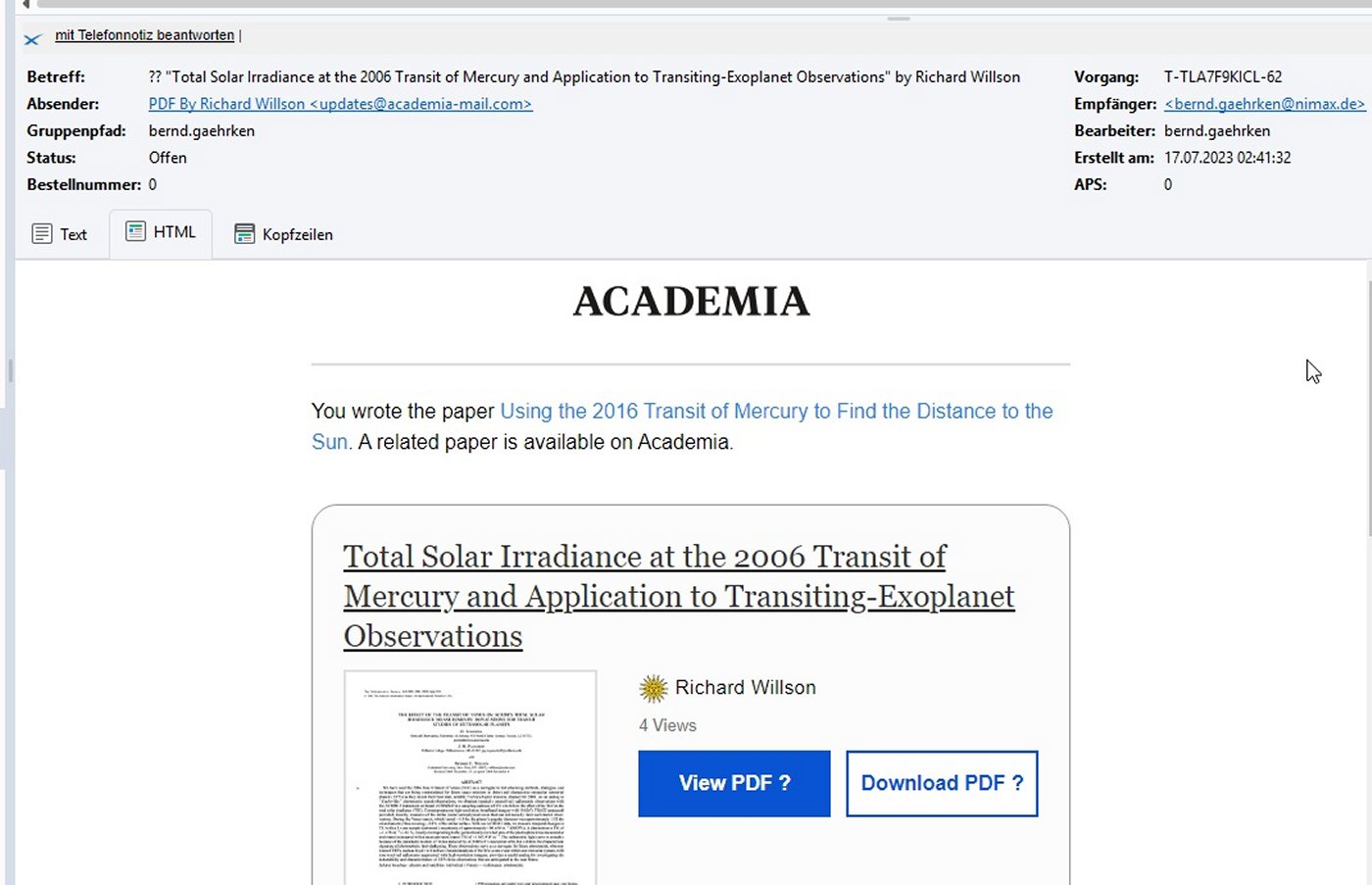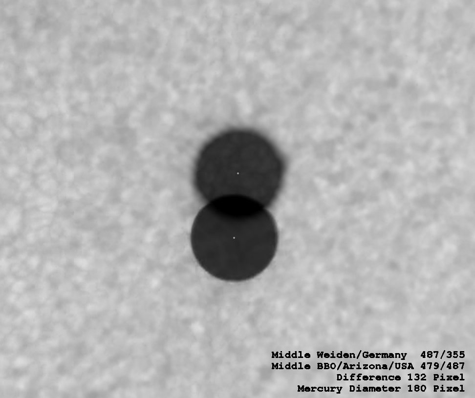 Der Abstand zwischen den Mittelpunkten der Scheibchen liegt auf dem folgenden Bild bei 132 Pixeln. Der Merkur selbst bietet sich als Referenz an. Er ist 180 Pixel groß. Die 180 Pixel entsprechen 12,1 Bogensekunden. Die beiden Scheibchen sind also 8,87 Bogensekunden voneinander entfernt.