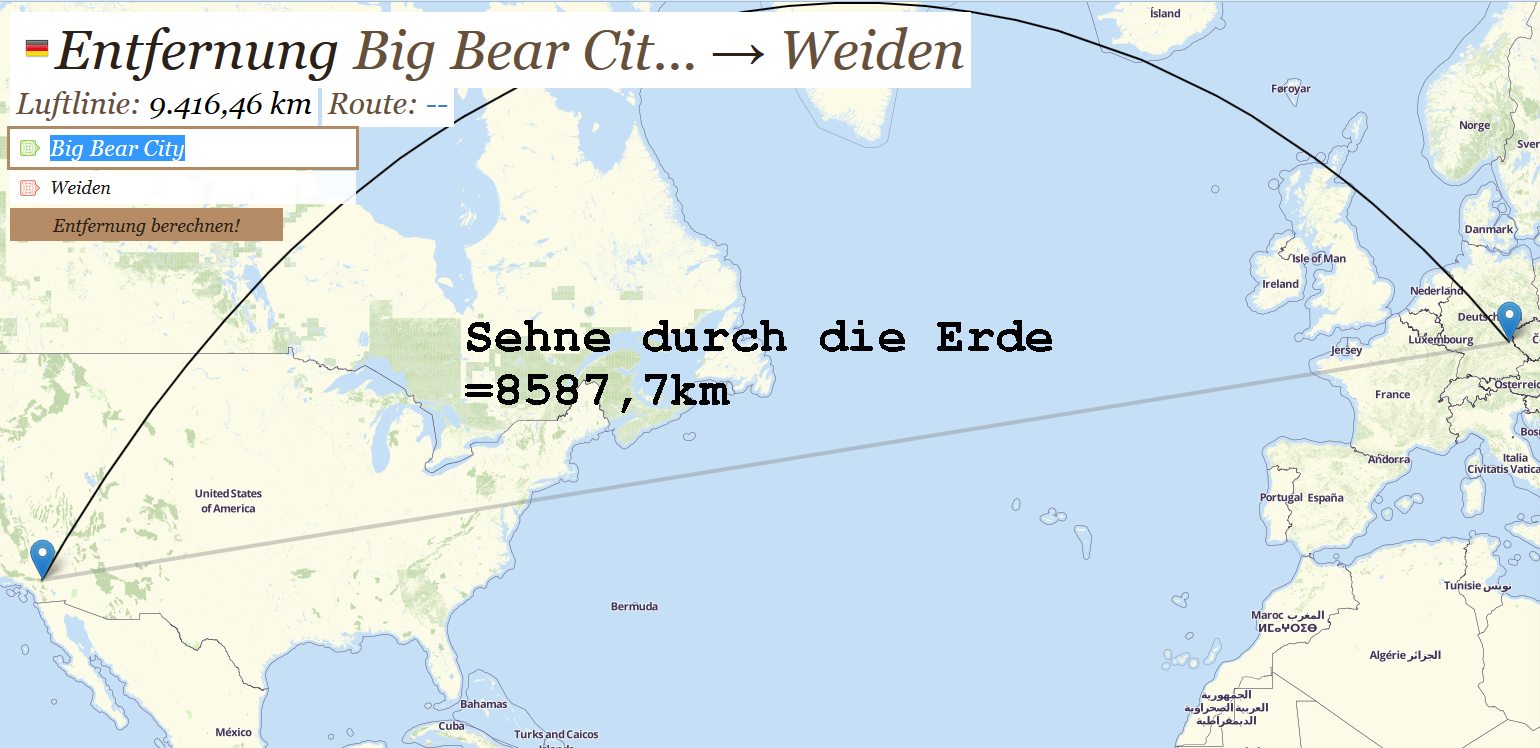 Nun muss noch der Abstand zwischen den Standorten in Weiden/Deutschland und BigBearCity in Kalifornien bestimmt werden. Die Luftline beträgt 9416,46 km. Die Berechnung erfolgte mit https://www.luftlinie.org/Europa/Usa