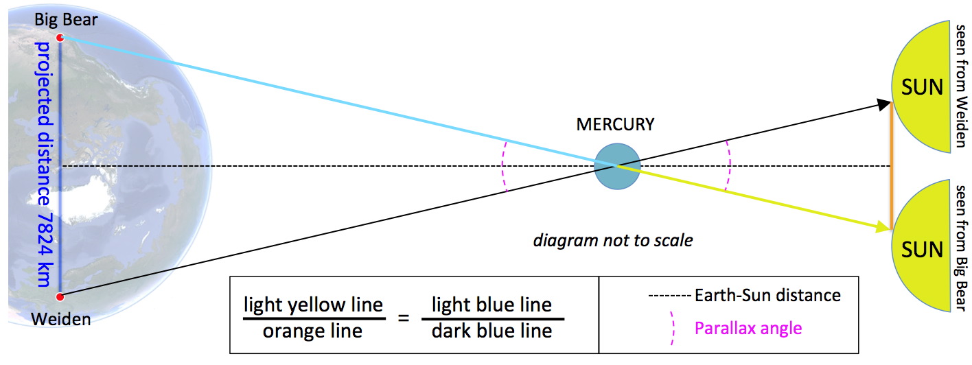Dieser Wert entspräche dem Anblick aus der Richtung der Sonne wenn exakt zwischen den beiden Standorten Mittag wäre, denn dann wäre der Horizontabstand der Sonne an beiden Standorten gleich groß. Tatsächlich stand jedoch zum Aufnahmezeitpunkt in Weiden die Sonne nur 19,35 Grad über dem Horizont während es in BigBearCity 43,7 Grad gewesen sind. Die Differenz von 24,35 Grad verkürzt die Sichtlinie aus der Perspektive der Sonne auf cos(24,35)*8587,7. Das sind 7824 km.