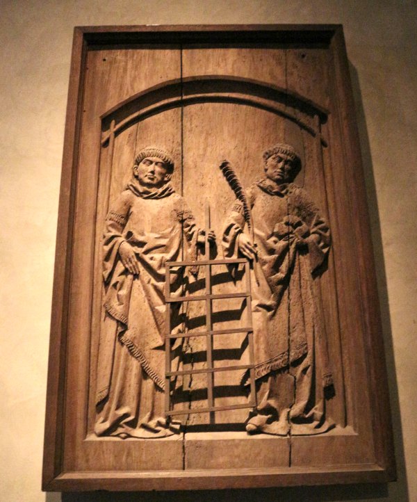 Laurenz mit Rost auf einem Wandrelief. Einmal in Holz und einmal in