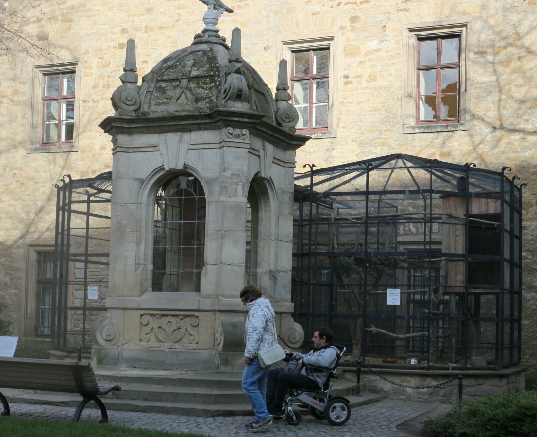 des angestammten Käfigs vor dem Schloss. Der Rabe lebt nun mit