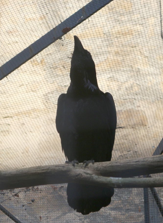 Ein solcher Rabe wird auch heute noch in einem Käfig gehalten,
