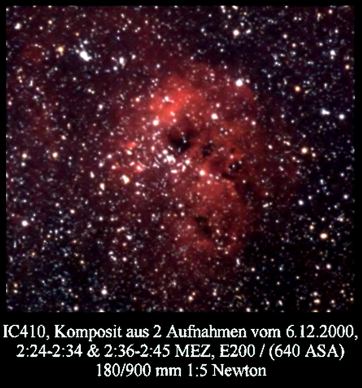 einen gestreuten Sternhaufen im Sternbild Fuhrmann. IC410 ist recht flächig und bildet zusammen mit dem