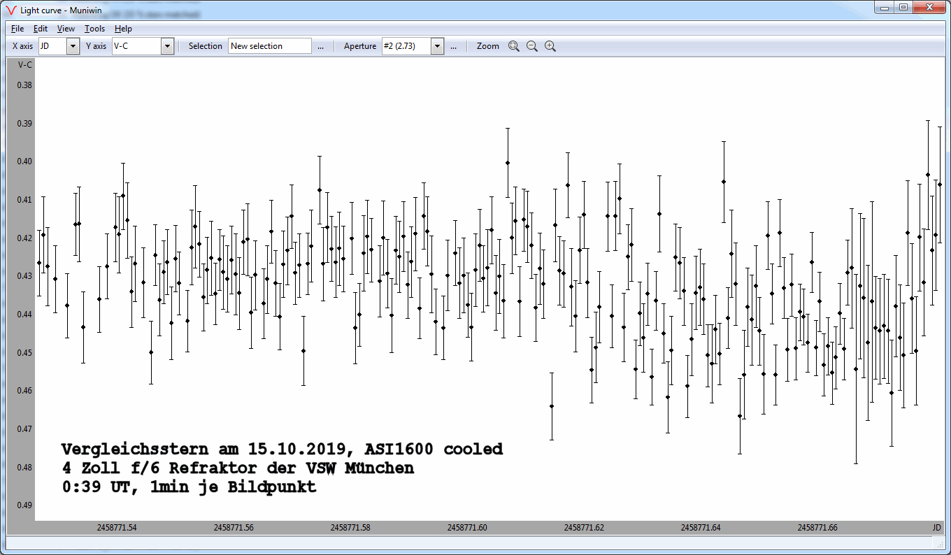 Die ASI1600 gibt es kein Binning daher waren die Belichtungszeiten mit 1min recht lang. Der Chip ist aber recht groß, so das ein umfangreiches Ensemble an Vergleichssternen herangezogen werden konnte.