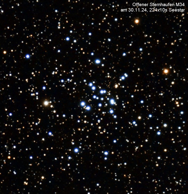 M34 ist ein lockerer Haufen der aus etwa 3 Dutzend hellen Sternen