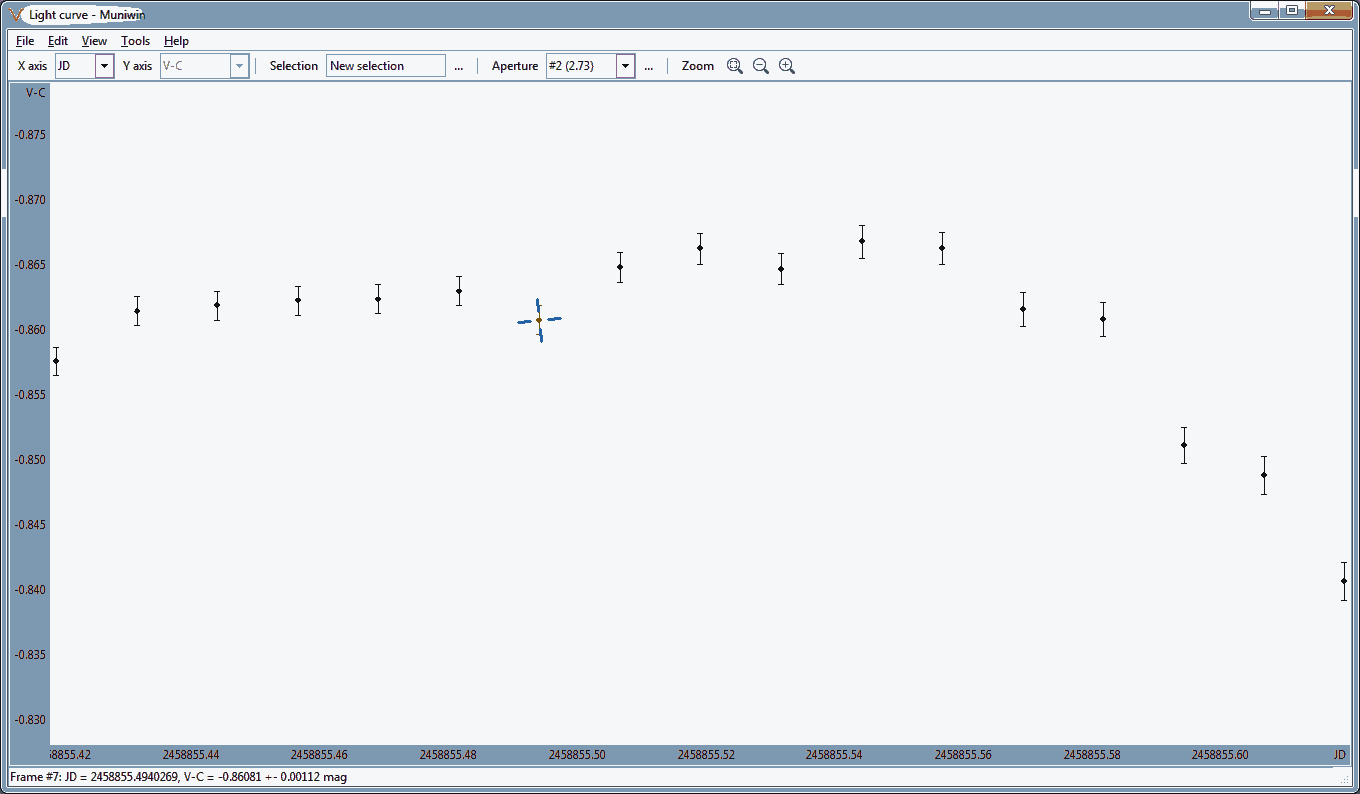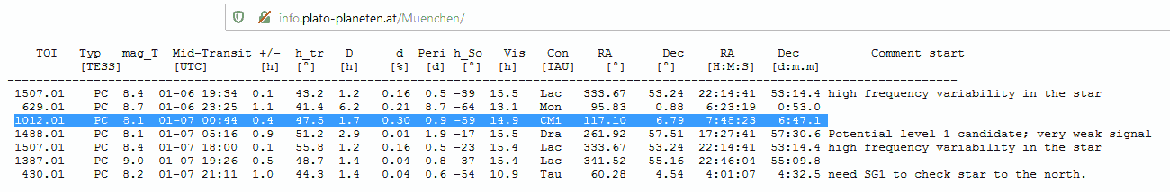 TOI 1012.01 ist ein Stern mit 8,1mag im Kleinen Hund. Nach dem Daten des TESS-Satelliten ist er ein Kandidat für einen Exoplanetentransit. Allerdings ist die erwartete Amplitude mit 0,003 mag sehr gering. I.d.R. lassen sich an der Volkssternwarte in Münchener Innenstadt nur Amplituden >= 0,01mag gut messen. Die Bedingungen waren jedoch in der Nacht vom 6. auf den 7.1. sehr konstant und so wurde einfach mal ein Versuch riskiert.