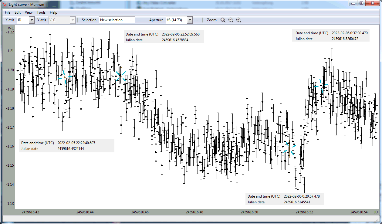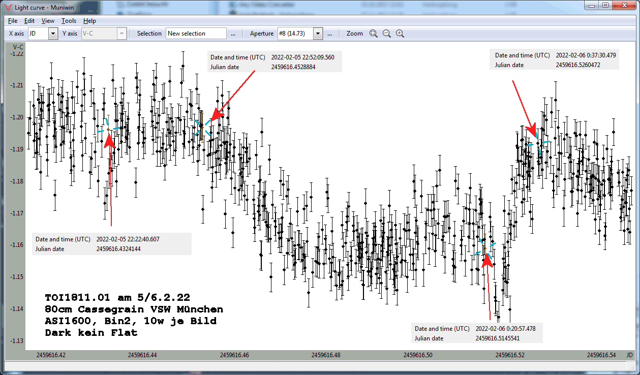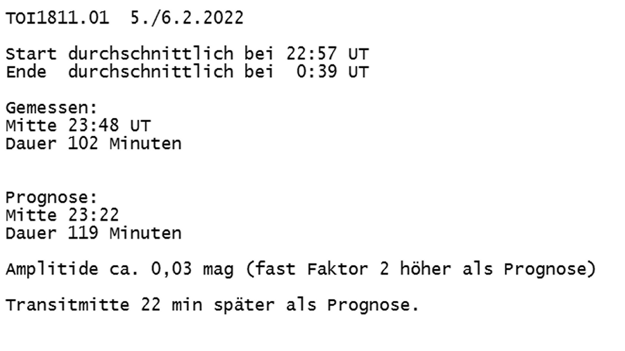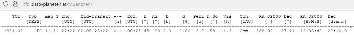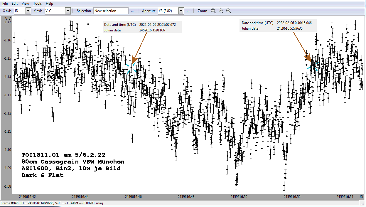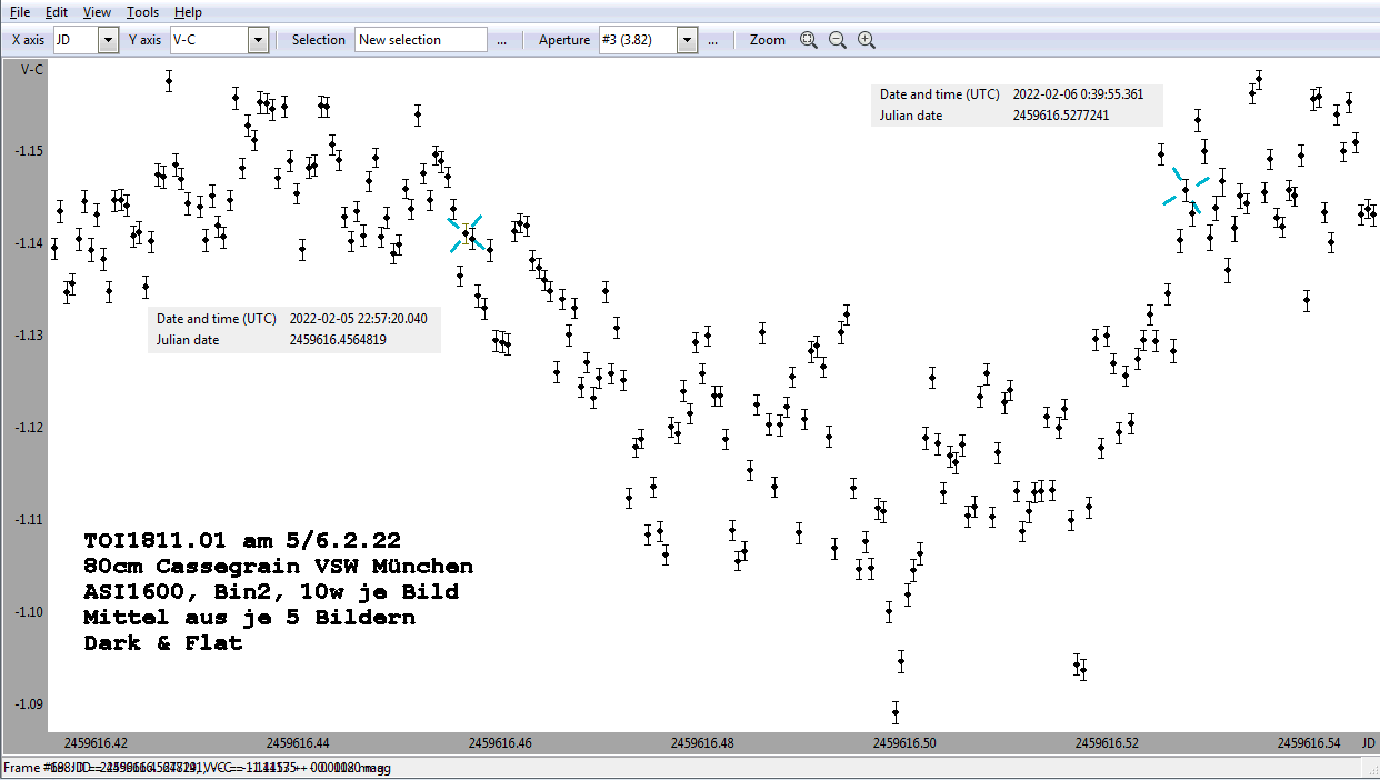 Die noch nicht bestätigten Zielsterne werden als TESS Objects of Interest (TOI) bezeichnet. Zu diesen Objekten zählt auch TOI 1811.01. Es handelt sich um einen 11 mag Stern in der Coma. In der Nacht vom 5.2.22 stand der Stern für München günstig und wurde photometriert.