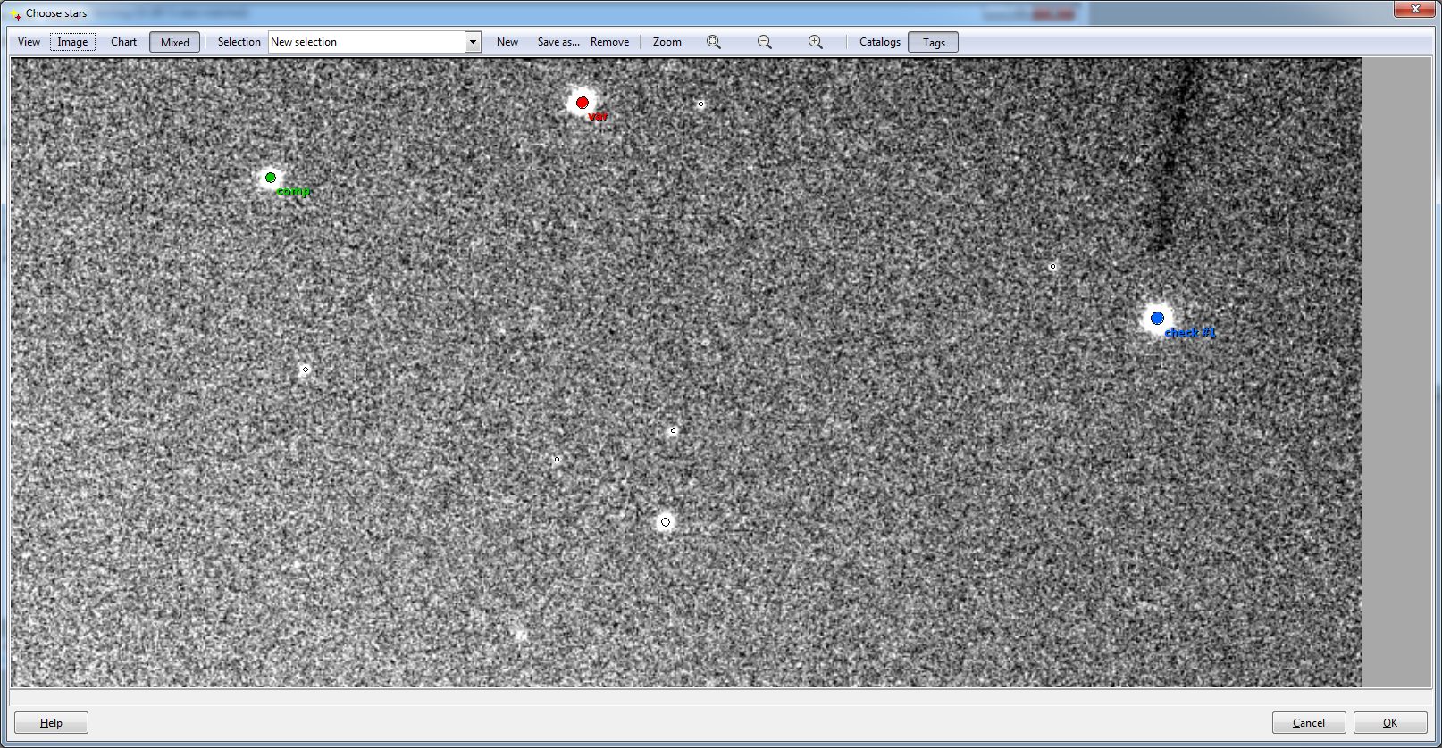 Coma ist kein Milchstraßensternbild und Vergleichssterne sind daher bei 11 mag relativ dünn gesät. Ausnahmsweise wurde daher statt einer CCD ein größerer CMOS-Chip verwendet.