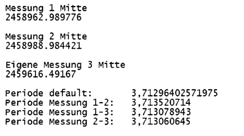 Wenn man die Perioden der Messungen durchrechnet, spricht das für eine mittlere Periode um 3,71307d und leichte Transit-Timing-Variations.